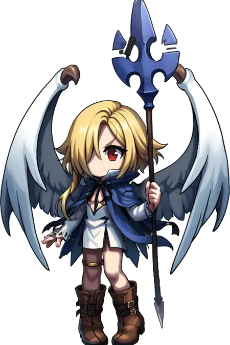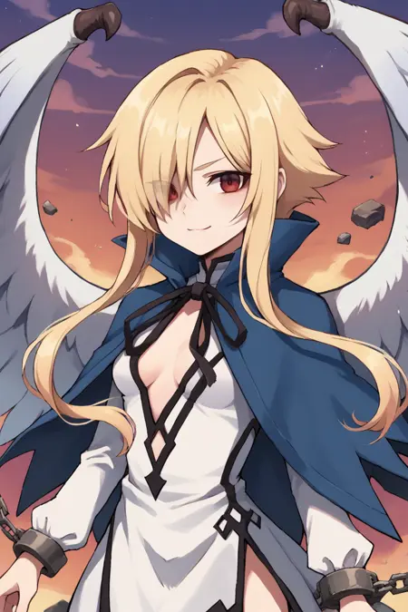 • Awakened: thrdef, 1girl, blonde hair, long hair, medium hair with long locks, hair over one eye, red eyes, wings, white wings, feathered wings, dress, white dress, short dress, blue cloak, popped collar, neck ribbon, black ribbon, center opening, long sleeves, thighlet, boots, chain