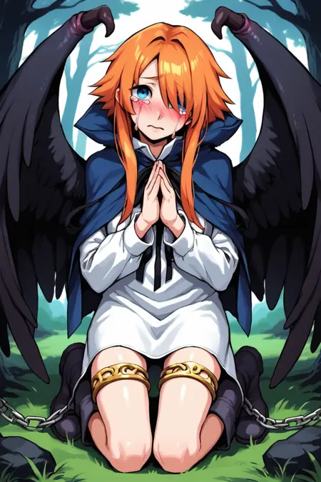 • Base: thrdef, 1girl, orange hair, long hair, medium hair with long locks, hair over one eye, blue eyes, wings, black wings, feathered wings, dress, white dress, short dress, blue cloak, popped collar, neck ribbon, black ribbon, center opening, long sleeves, thighlet, boots, chain
