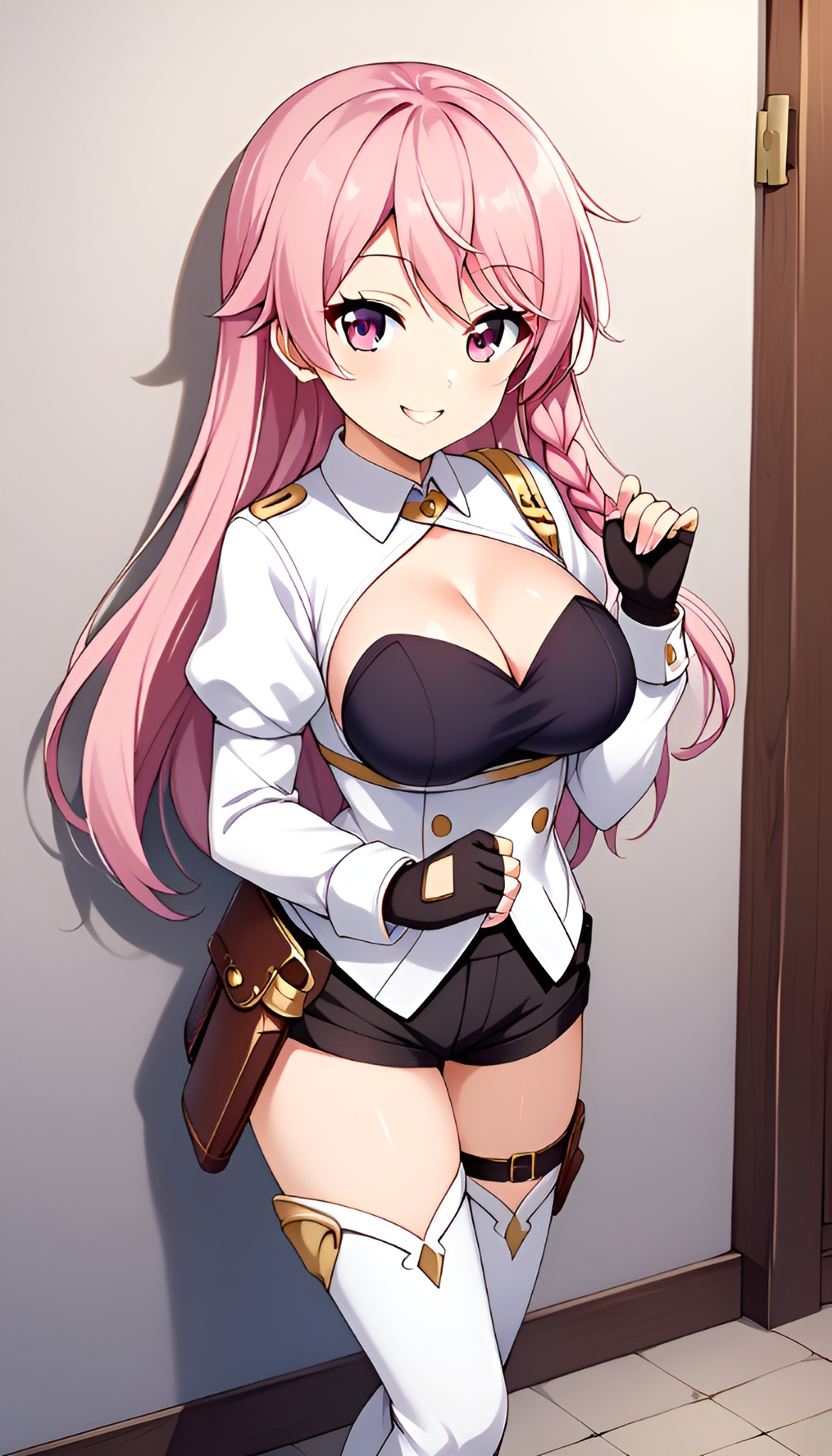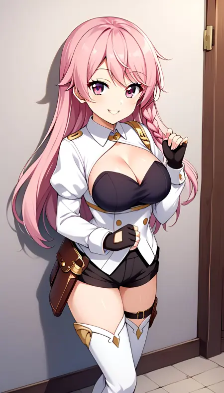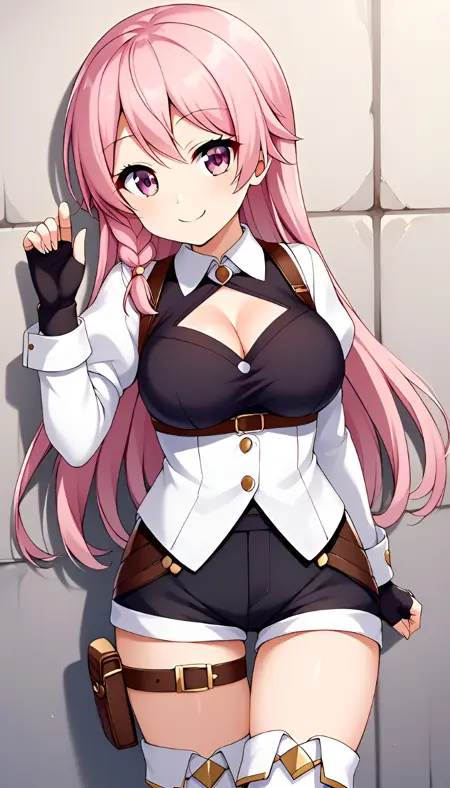 激活标签为:"luna_heela, 1girl, solo, pink hair, long hair, side braid, pink eyes, long ears, medium breasts, puffy sleeves, white sleeves, black shirt, white jacket, black gloves, fingerless gloves, cleavage, short pants, black pants, holster, white thigh boots",建议同时使用 "anime coloring" 标签。