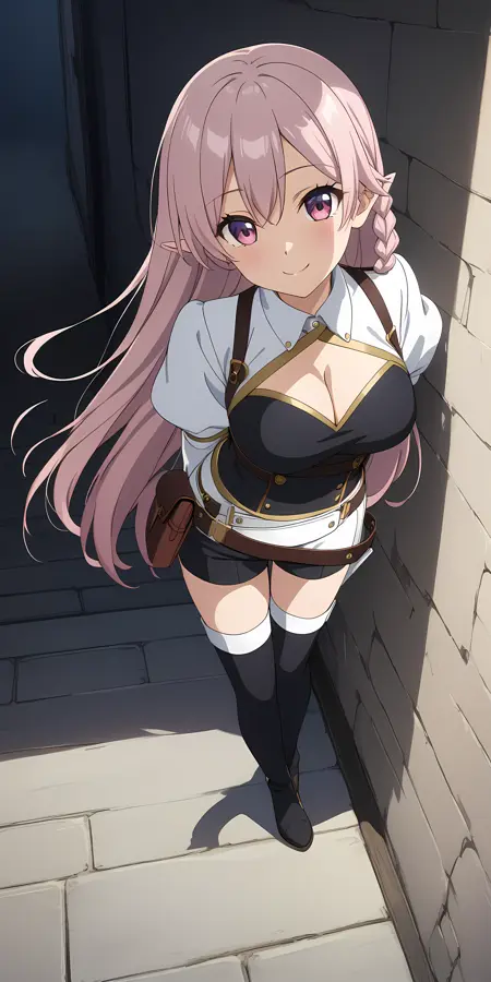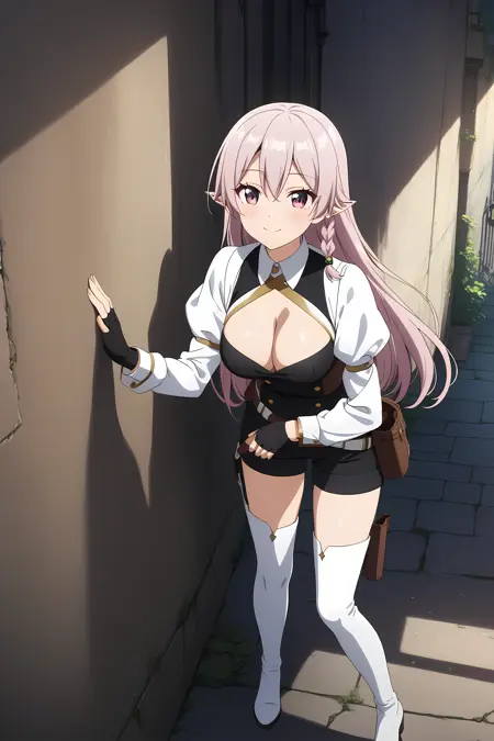 激活标签为:"luna_heela, 1girl, solo, pink hair, long hair, side braid, pink eyes, long ears, medium breasts, puffy sleeves, white sleeves, black shirt, white jacket, black gloves, fingerless gloves, cleavage, short pants, black pants, holster, white thigh boots",建议同时使用 "anime coloring" 标签。