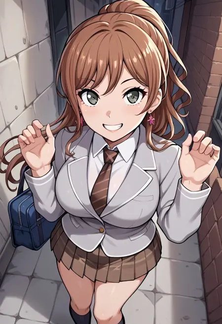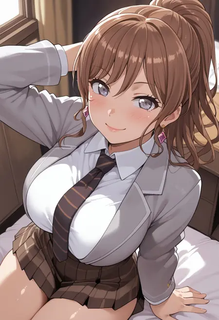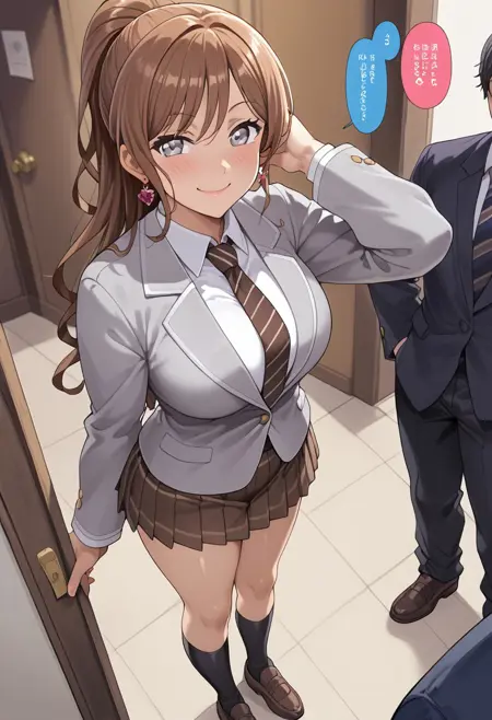 school uniform, striped necktie, brown necktie, collared shirt, grey jacket, long sleeves, plaid skirt, pleated skirt,short skirt, brown skirt