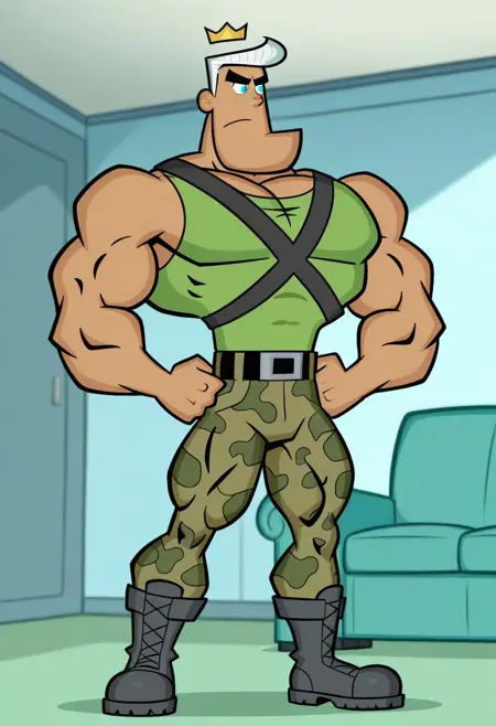 jorgen: 1boy, jorgenvs, blue eyes, thick eyebrows, white hair, short hair, muscular, crown, green tank top, camouflage pants, boots, belt, posing, friendly
