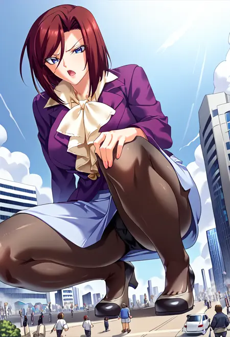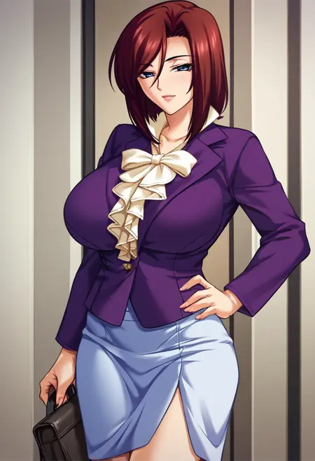 Outfit: "purple jacket, ascot, pencil skirt, white skirt, pantyhose"