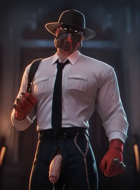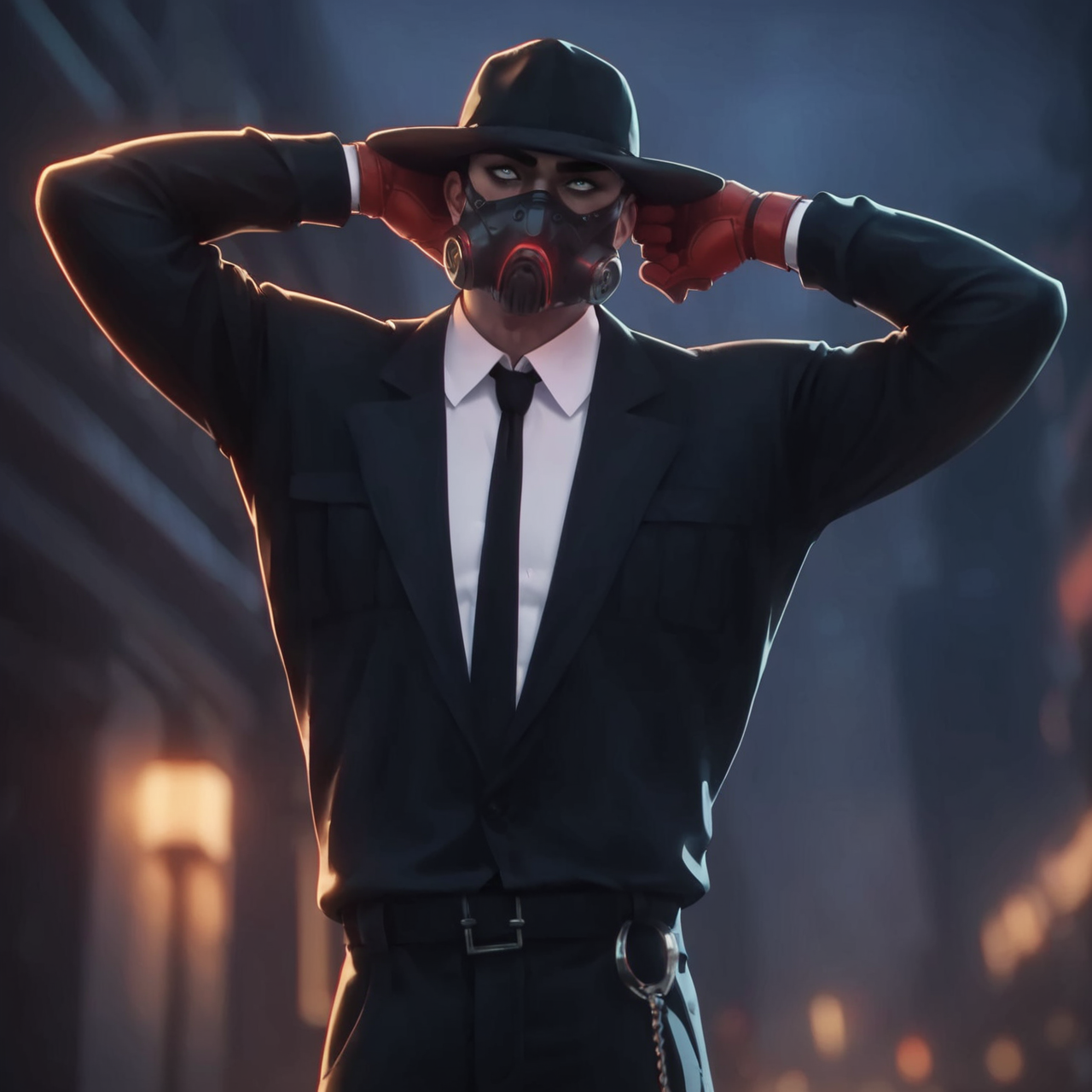 "gangster_tbhx, mask, detailed white eyes, necktie, gloves, hat, suit"
