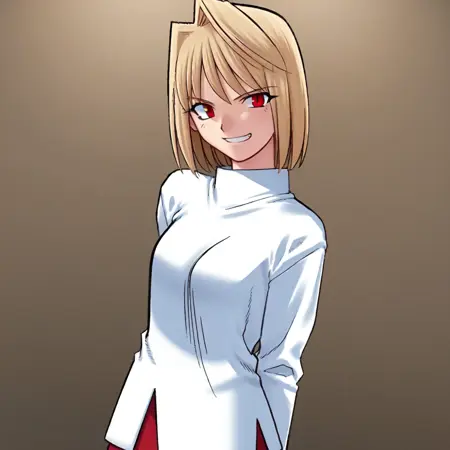 아쿠에이드, 보랏빛 스커트, 금발, 빨간 눈, 스웨터, 짧은 머리카락, 터틀넥, 스커트, 긴 스커트, 긴 소매