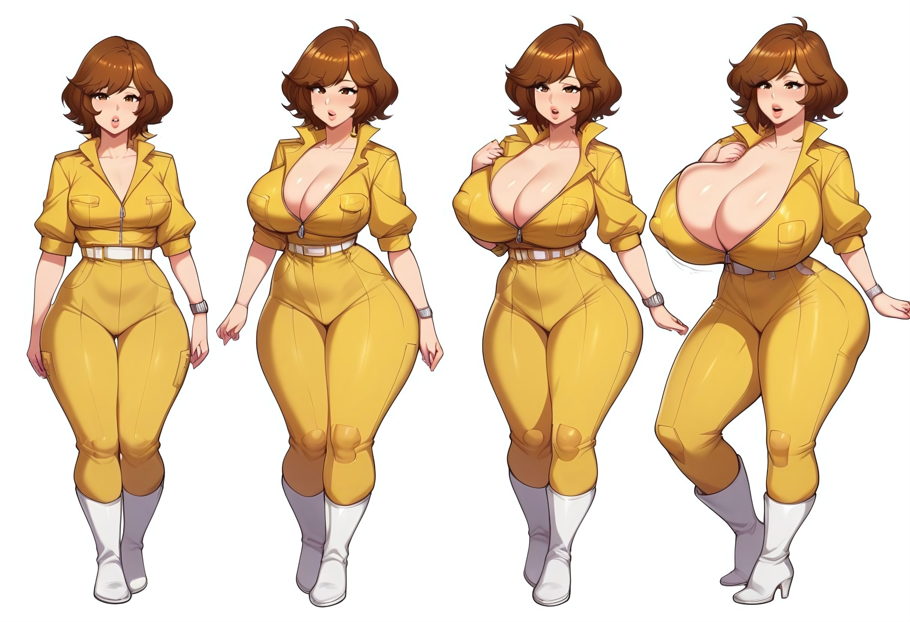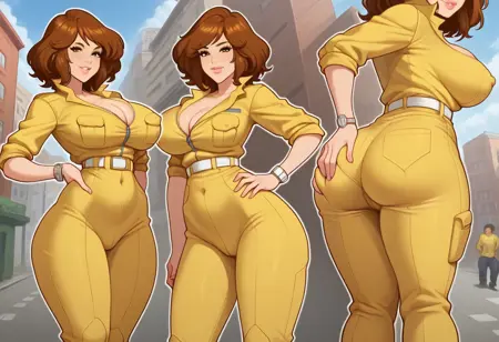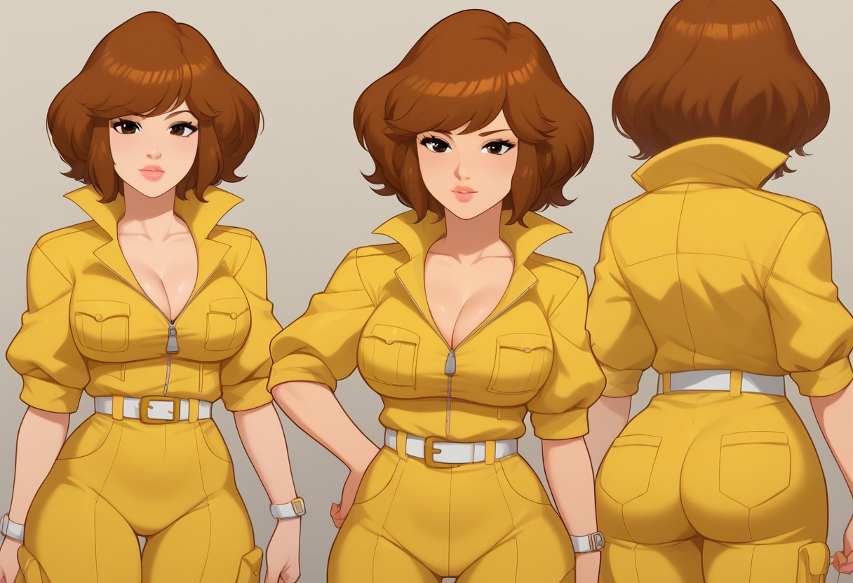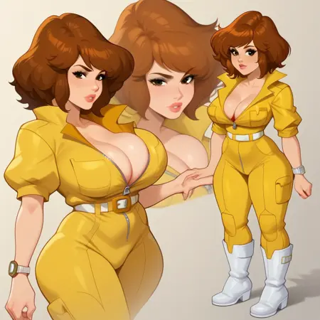 april o'neil, 1girl, short hair, brown hair, brown hair, brown eyes, lips, yellow jumpsuit, zipper, wrist watch, white belt, white boots, deep cleavage, April80, curvy