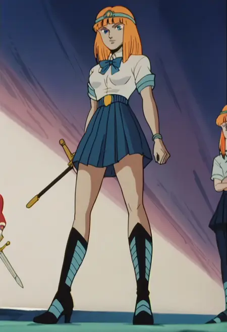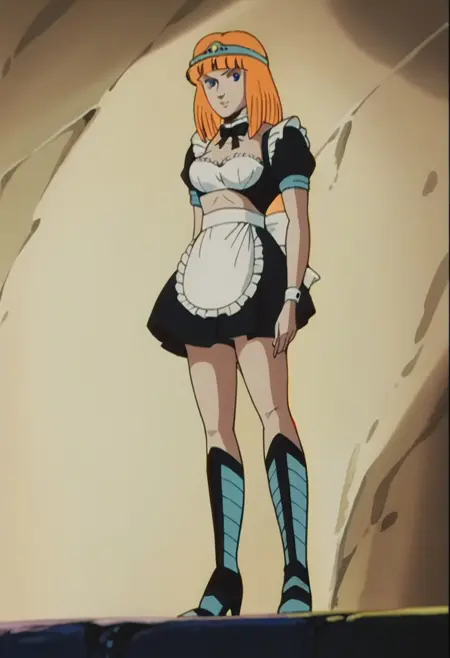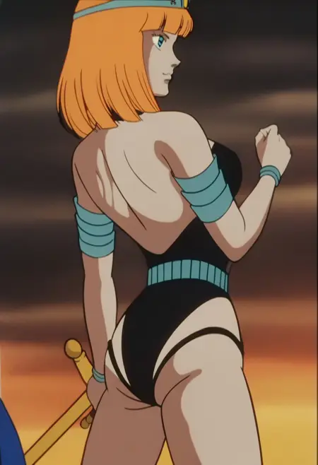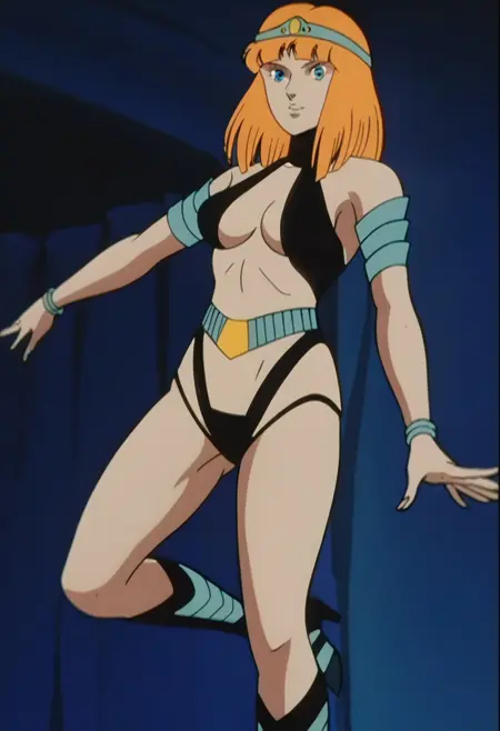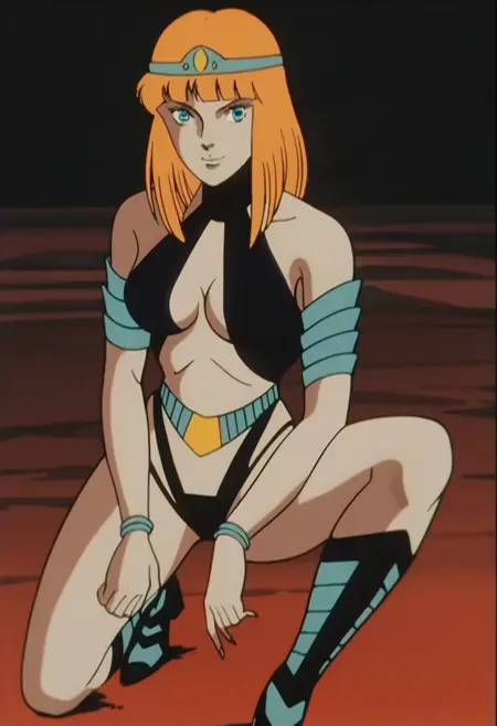 主なタグ: "shmnmzg3r, 青い目, 横長の瞳孔, ブラックレオタード, 衣服の切り抜き, ハイヒールブーツ, ネイキーブーツ, 冠, アームレット, ブレスレット, ベルト, ハルターネック, レトロアートスタイル, 1980年代(スタイル), アニメスクショーン"