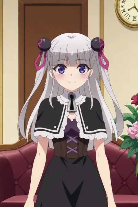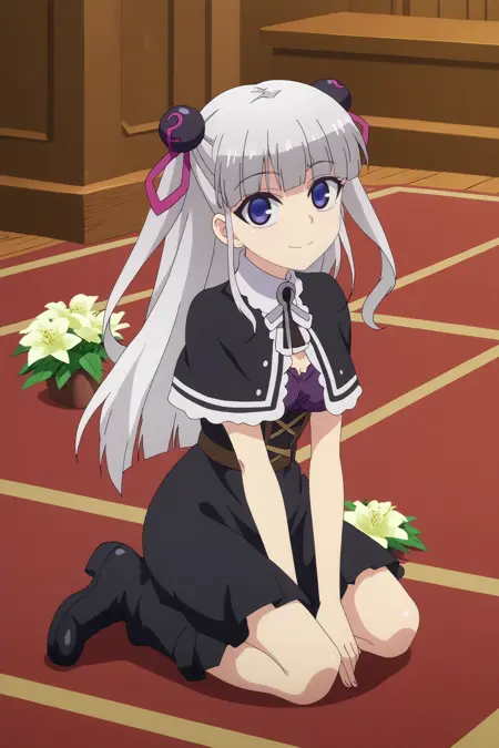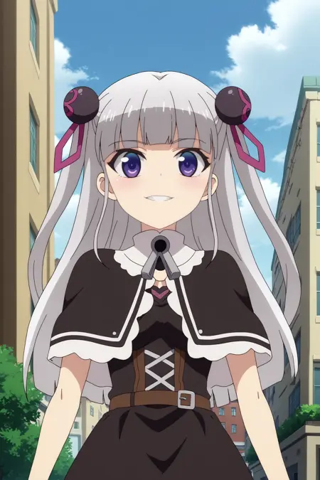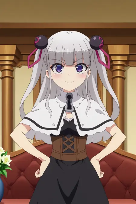 トリガー: maria naruse,1girl,long hair,hair ornament,grey hair,bangs,ribbon,hair ribbon,capelet,breasts,dress,black dress