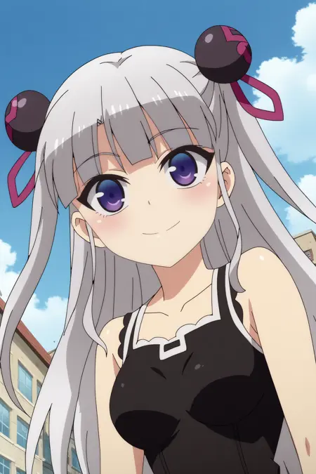 カジュアルな服装: maria naruse,1girl,long hair,hair ornament,grey hair,bangs,ribbon,hair ribbon,collarbone,breasts,sleeveless,bare shoulders