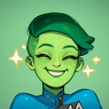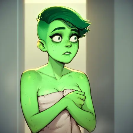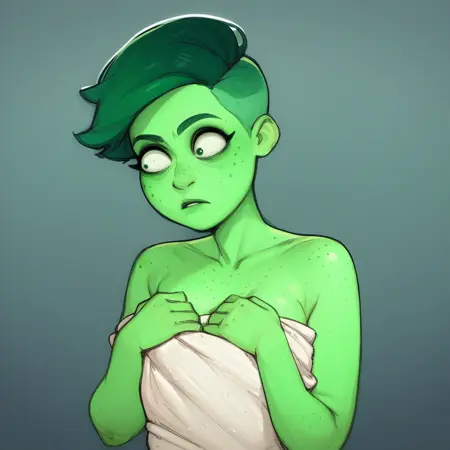 score_9, score_8_up, score_7_up, dvana tendi, colored skin, green skin, solo, freckes, green hair, female focus