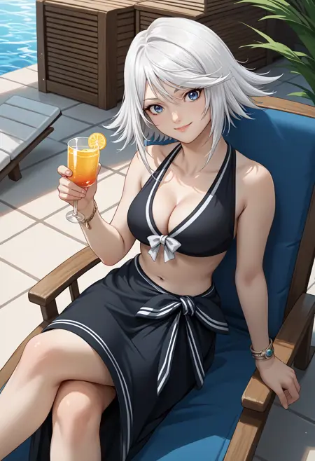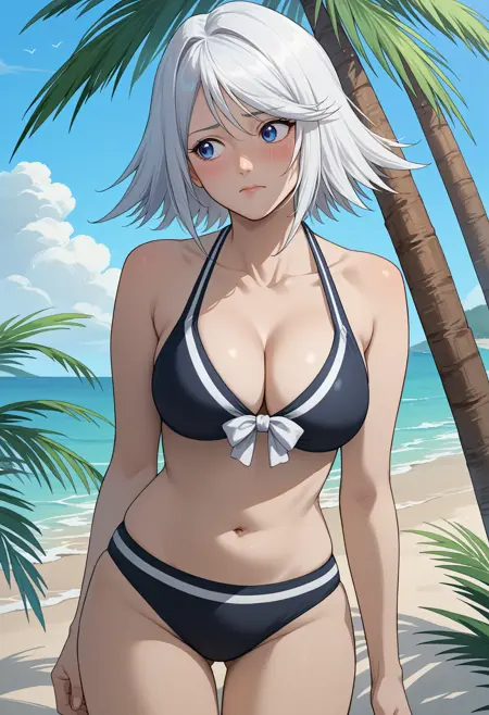 いいえ、太陽じゃない!水着: swmRne、白髪、短髪、青い目、黒いビキニ、胸元、肩出し、白いリボン、黒いサロペット、へそ、ブレスレット、サンダル、白い靴