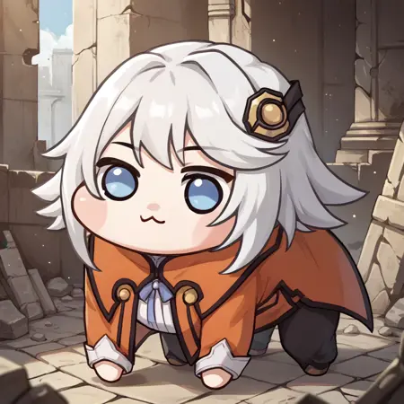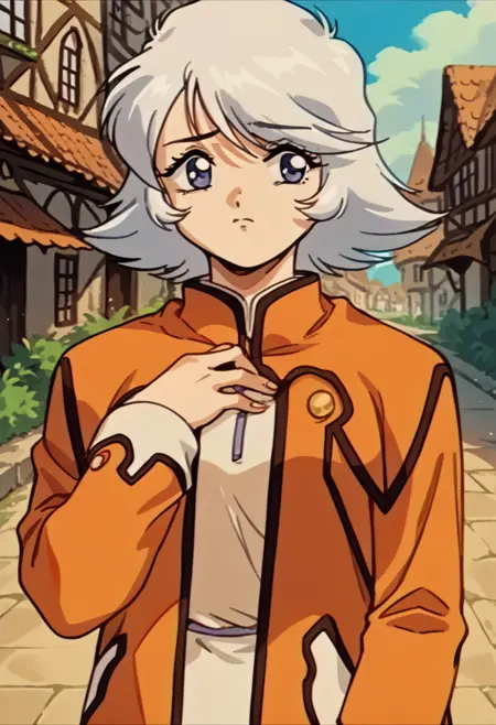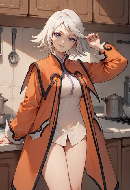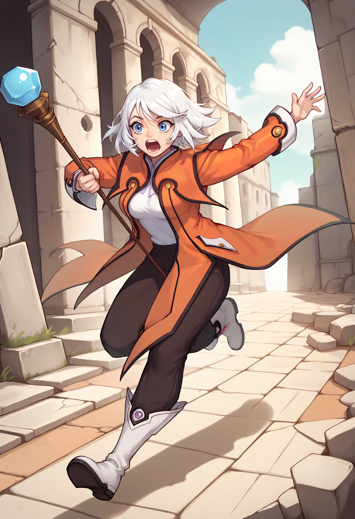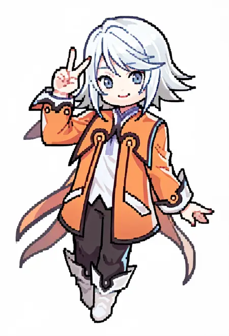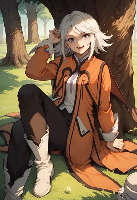 デフォルトの外観: defRne、白髪、短髪、青い目、オレンジ色のコート、中程度の胸、白いシャツ、長袖、黒いズボン、ブーツ、白い靴