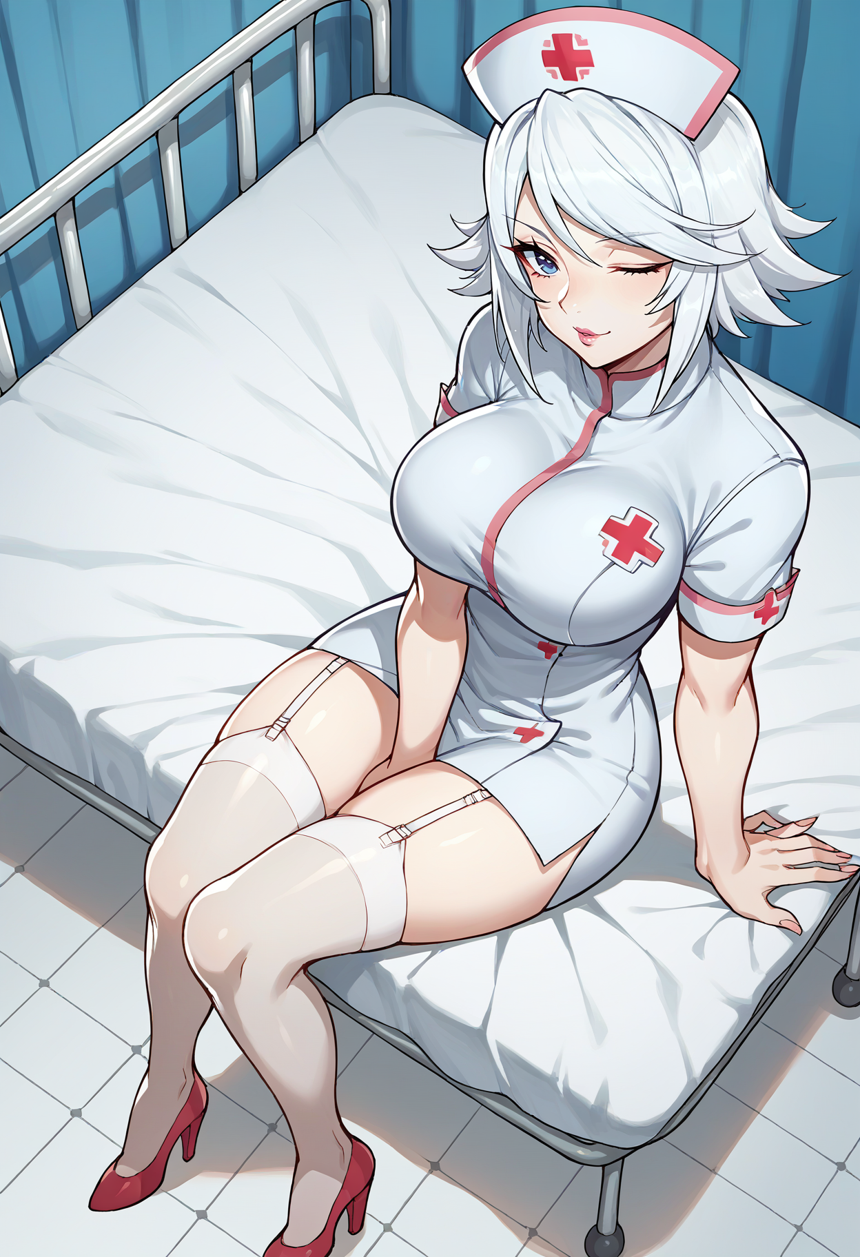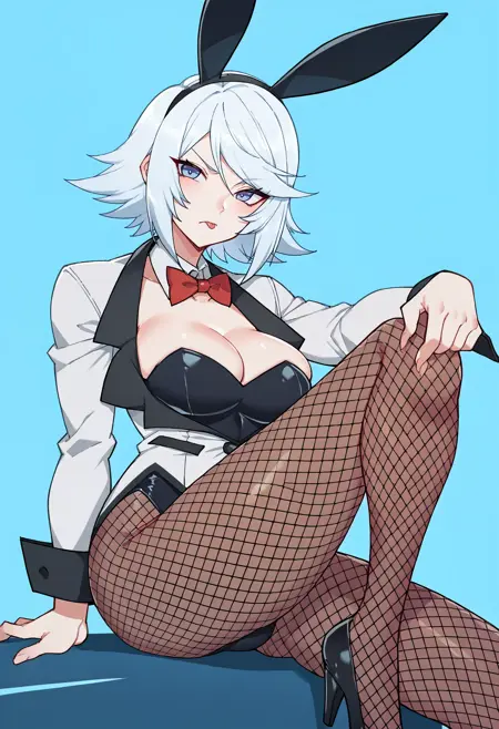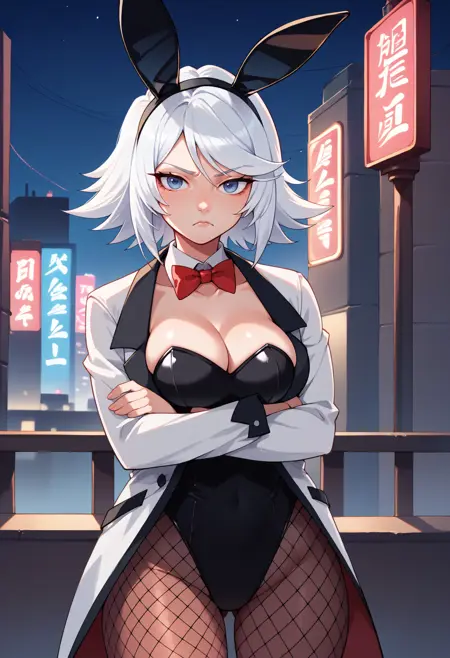 選ばれた美しさ、バニー衣装: bnyRne、白髪、短髪、青い目、プレイボーイベニー、赤いリボン、外した襟、胸元、黒いレオタード、白いジャケット、長袖、フィッシュネット、茶色のパンスト、ハイヒール、黒い靴