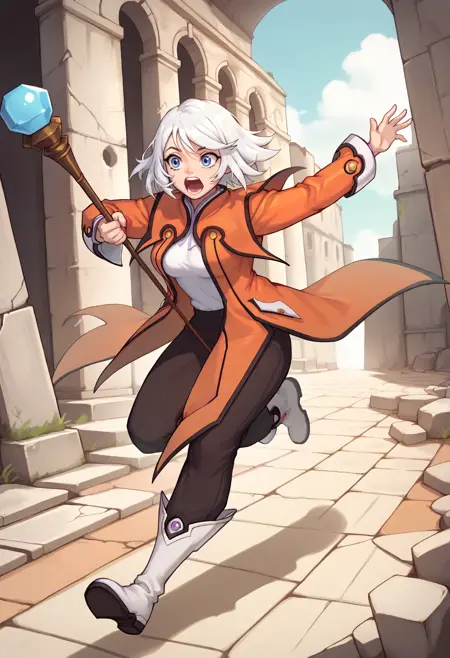 Default appearance: defRne, white hair, short hair, blue eyes, orange coat, medium breasts, white shirt, long sleeves, black pants, boots, white footwear