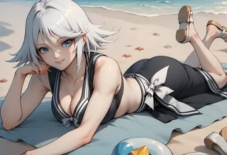 No, Not the Sun! Swimsuit: swmRne, white hair, short hair, blue eyes, black bikini, cleavage, bare shoulders, white bow, black sarong, navel, bracelet, sandals, white footwear