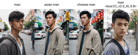 다음은 Realistic Vision v2.0 기반으로 진행된 4가지 비교 사례로, 기본 모델이 원래 가진 아시아인(Asian), 화교(Chinese) 이미지와 이 LoRA(가중치 0.8)를 사용했을 때의 차이를 보여줍니다.