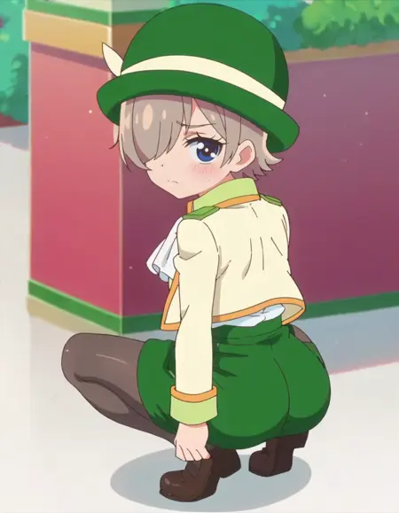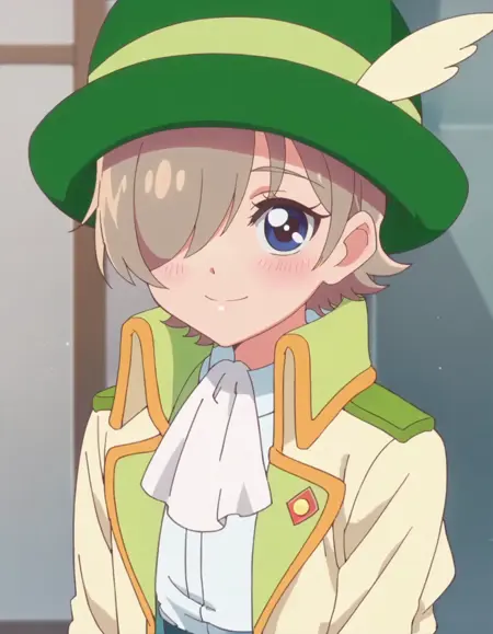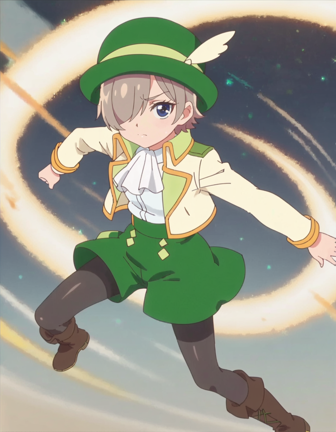 score_9, score_8_up, score_7_up, 1girl, solo, anime screencap,hat, hair over one eye, looking at viewer, yellow jacket, long sleeves, short hair, boots, white ascot, shorts, green skirt, black pantyhose, open clothes, closed mouth, white shirt, smile, blue eyes lora:Cerfeuil:0.8