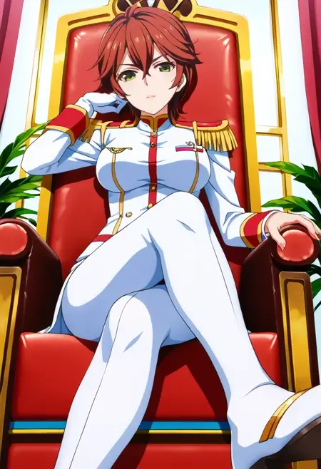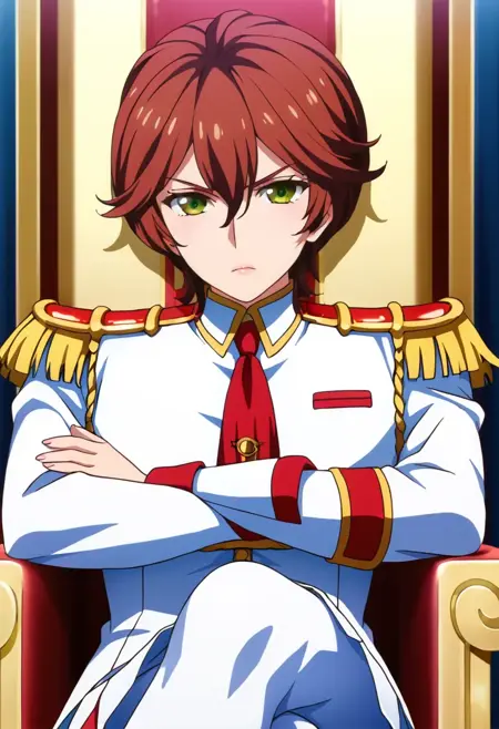 Hiragi Akira, red hair, short hair, brown hair, green eyes, hair between eyes, uniform, epaulettes, white uniform, military uniform, aiguillette,