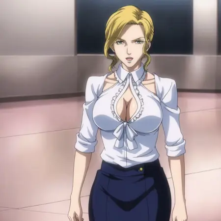 • 선생님 복장 트리거: EmmaFrostTeacherAnime, 큰 가슴, 1girl, 브라질리언, 단발, 금발 머리, 치마