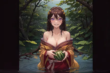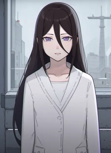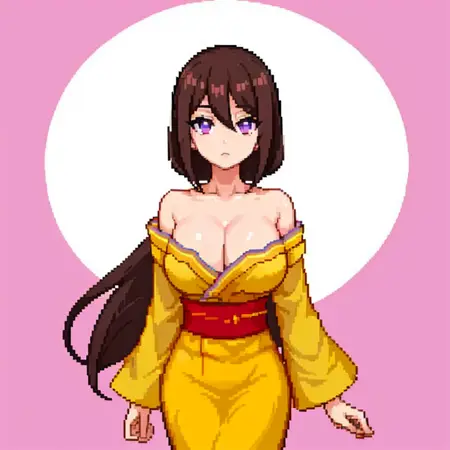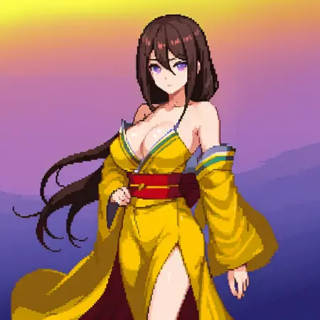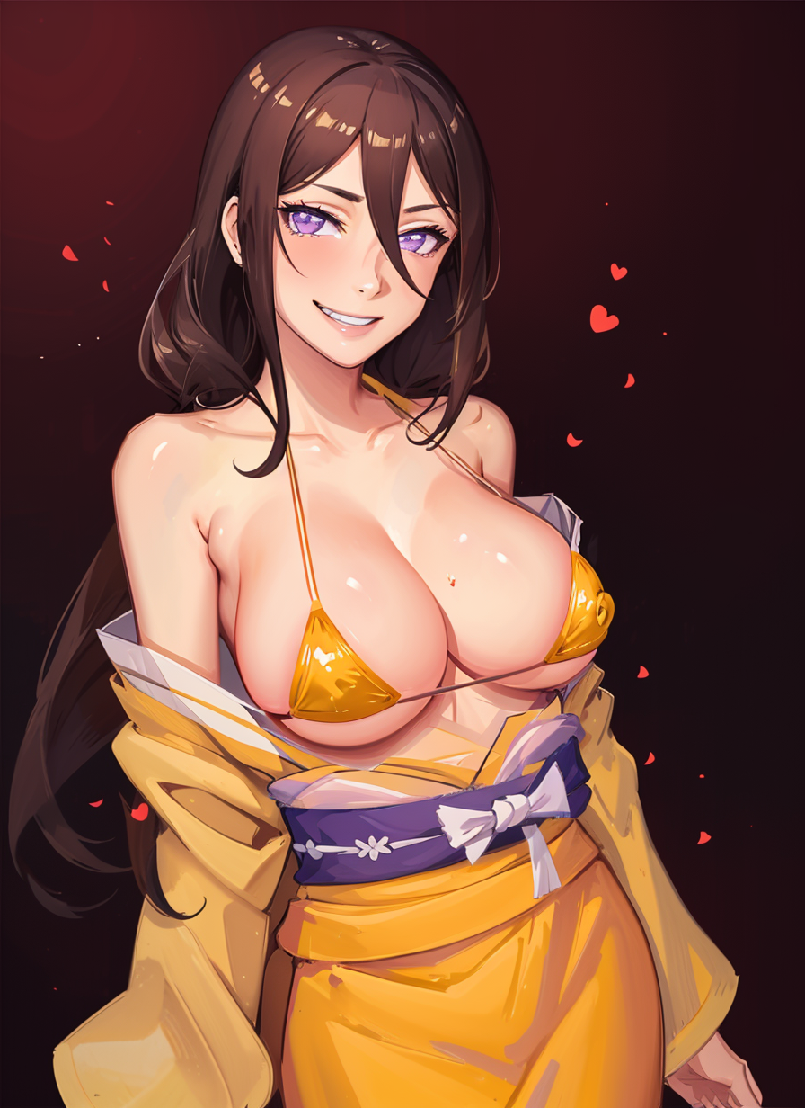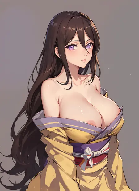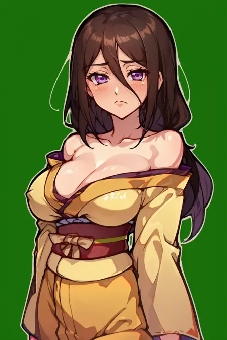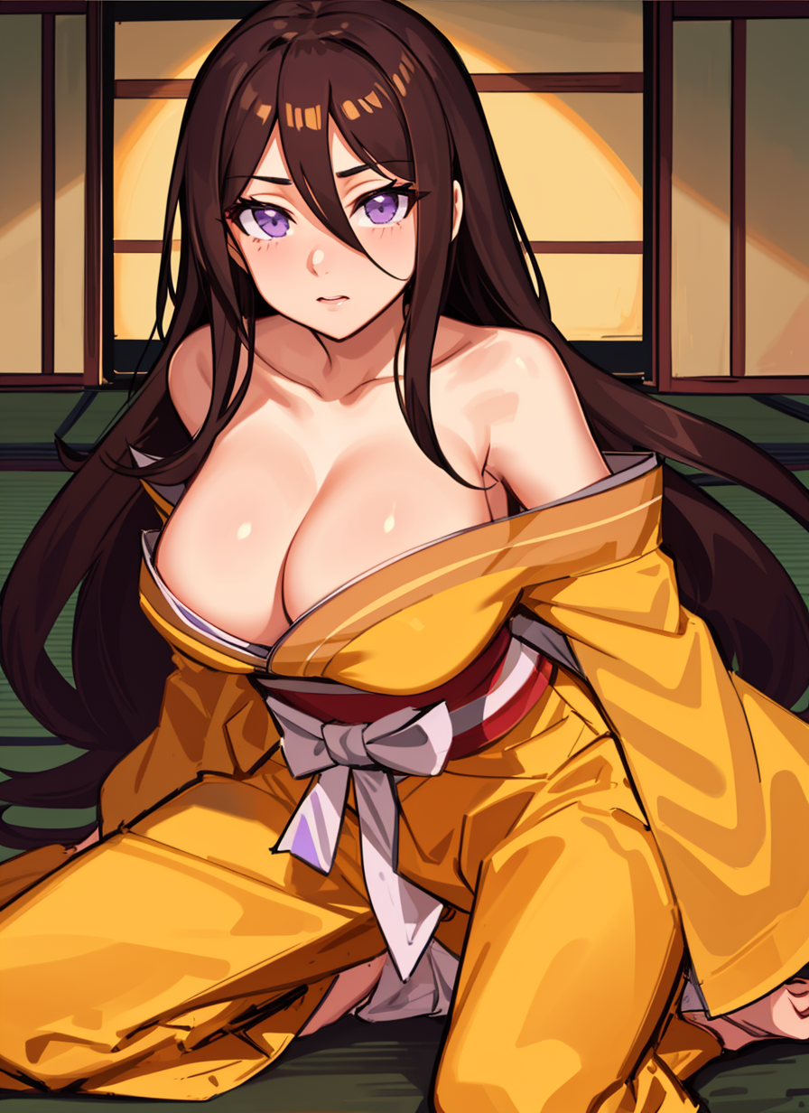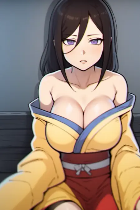hyuuga hanabi, brown hair, hair between eyes, long hair, purple eyes, bare shoulders, yellow kimono,