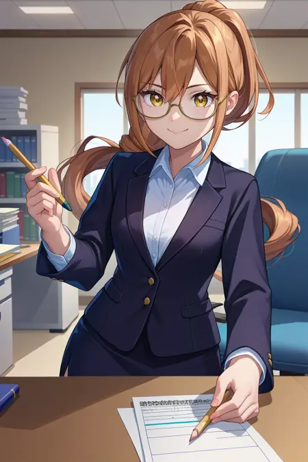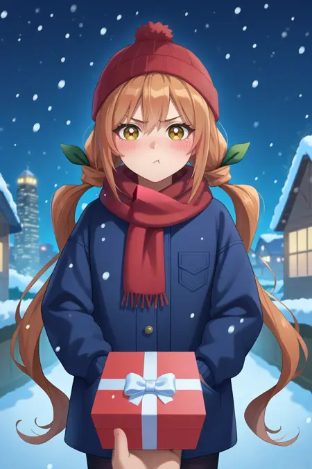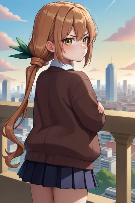 Appearance : indkrn, brown hair, yellow eyes, hair between eyes, low twintails, hair ribbon