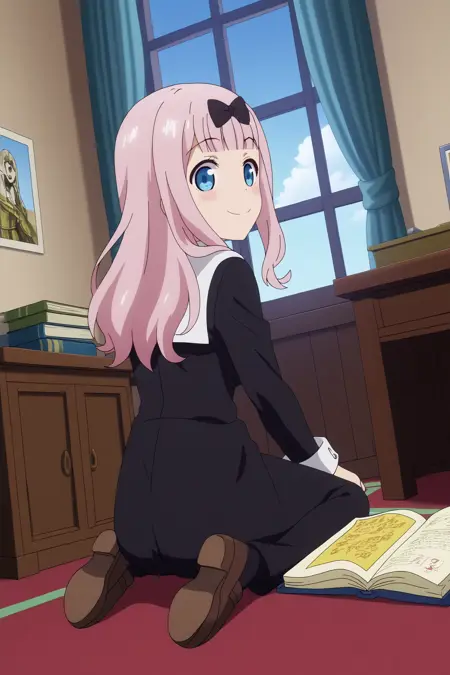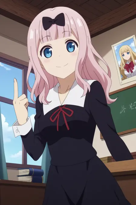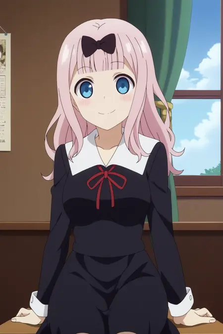 トリガー:chika fujiwara,1girl,shuuchiin academy school uniform,school uniform,black bow,bangs,smile,bow,red ribbon,blunt bangs