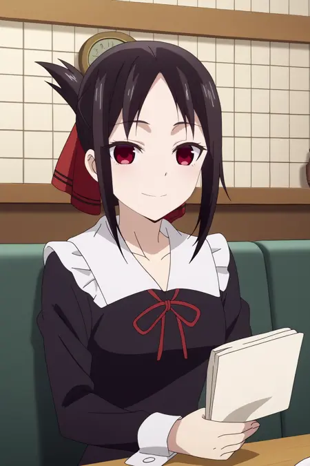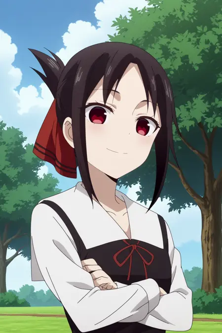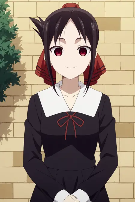 トリガー:kaguya shinomiya,1girl,shuuchiin academy school uniform,folded ponytail,ponytail,ribbon,school uniform,hair ribbon,red ribbon,parted bangs,bangs