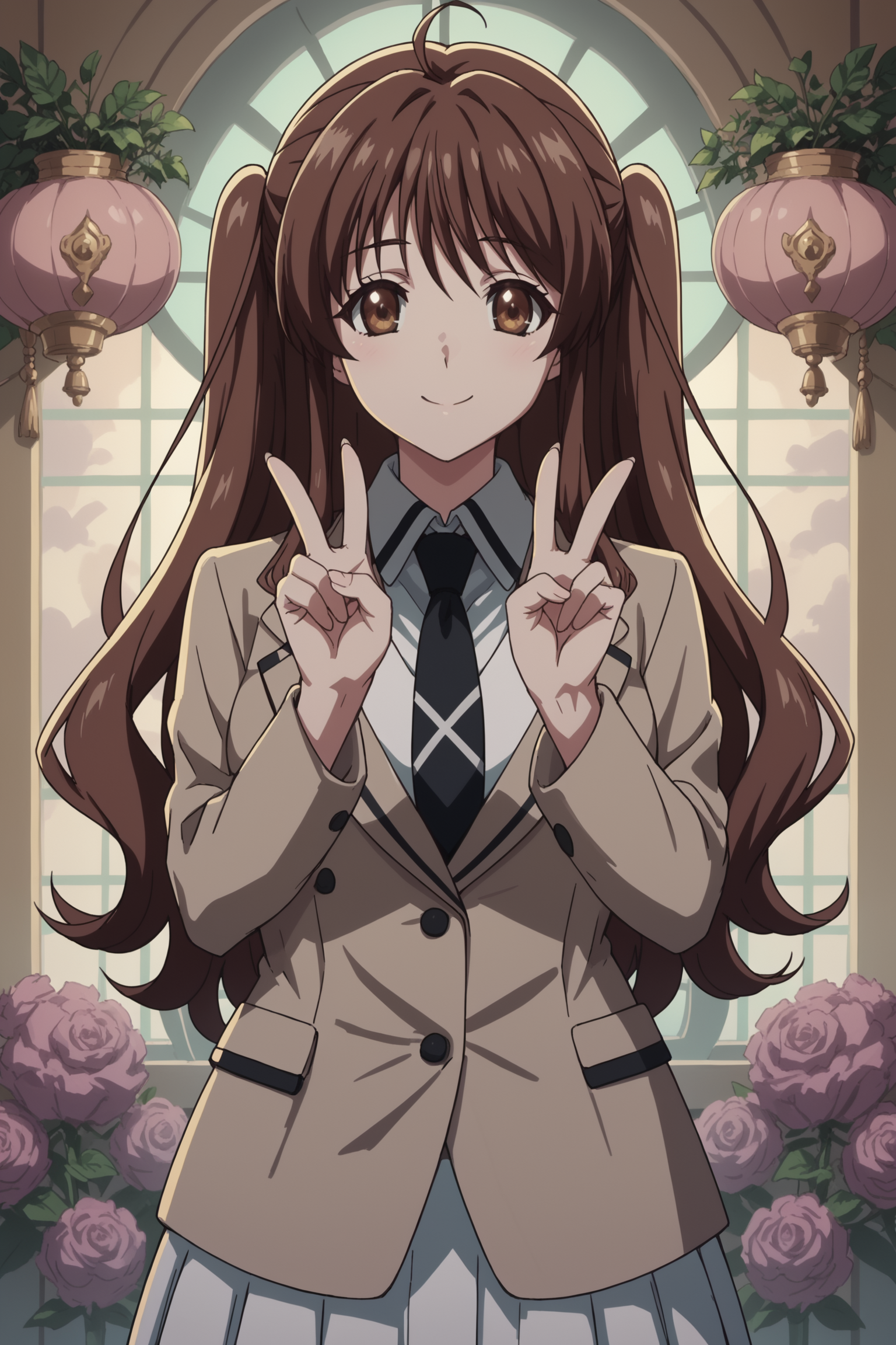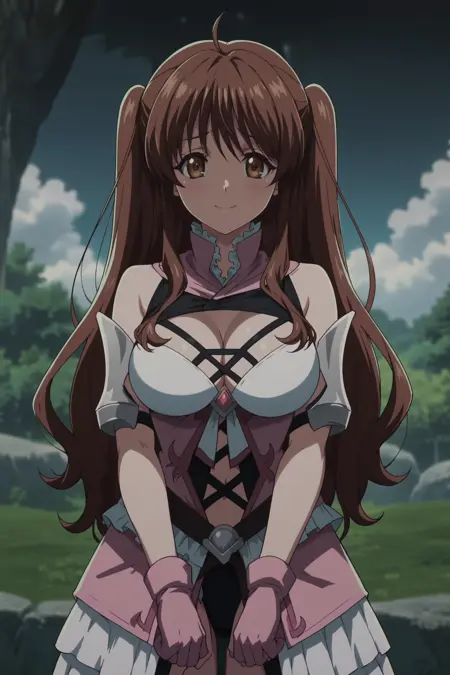 Recommended keywords: Long hair, brown hair, twintails, brown eyes, ahoge, large breasts