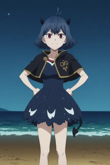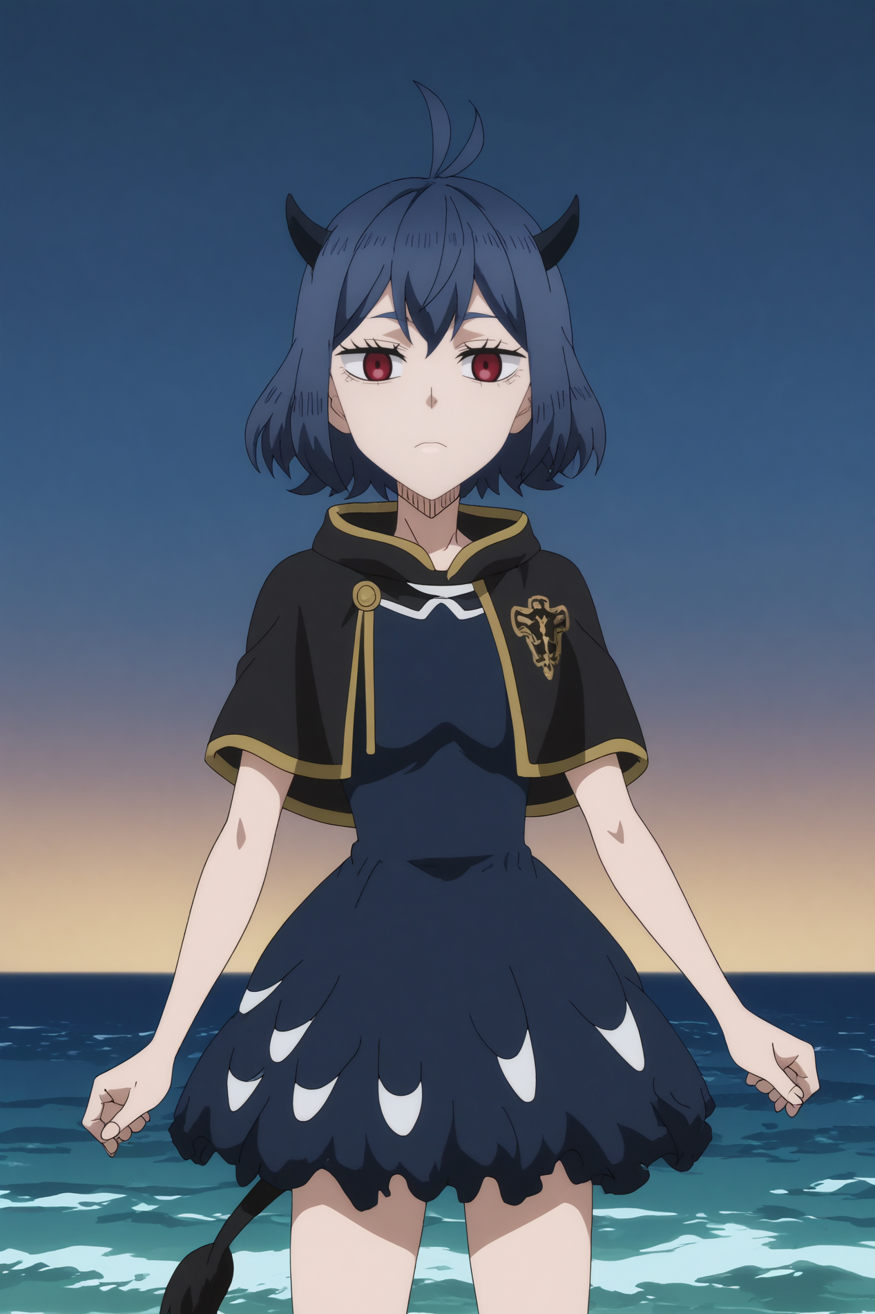 トリガー:secre_Swallowtail,1girl,solo,expressionless,dress,black dress,short hair,capelet,black capelet,horns
