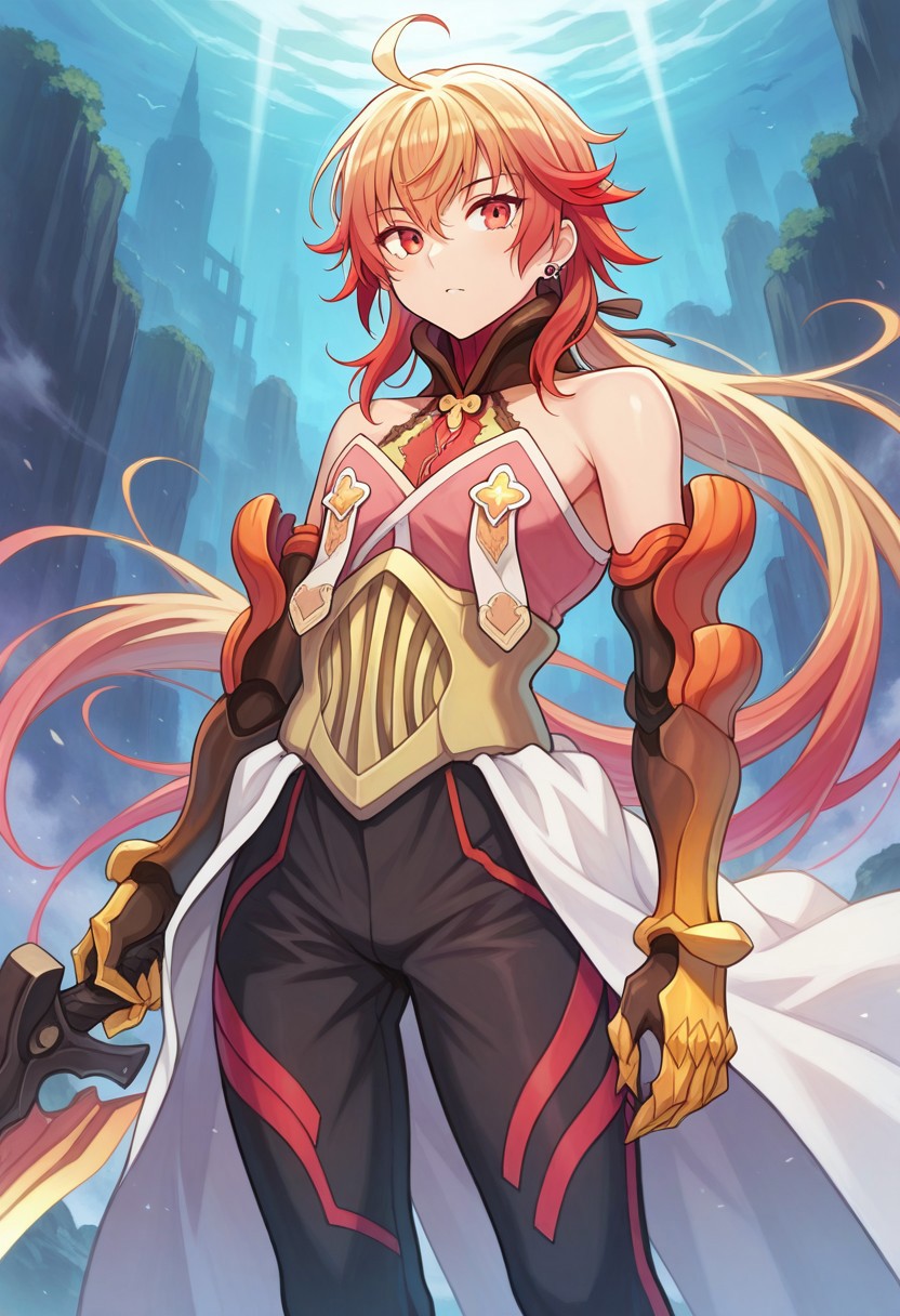 トリガーワード:ramafgo、インドの服、一人、赤髪、肩出し、赤い目、長い髪、1男孩、男性焦点、あほ毛、手袋、目の間に髪、武器、持っている、剣、鎧、武器を持ち、笑顔、前髪、剣を持っている、ズボン、ポニーテール、オレンジ髪、外れ袖、複色の髪、イヤリング、ジュエリー、黒ズボン