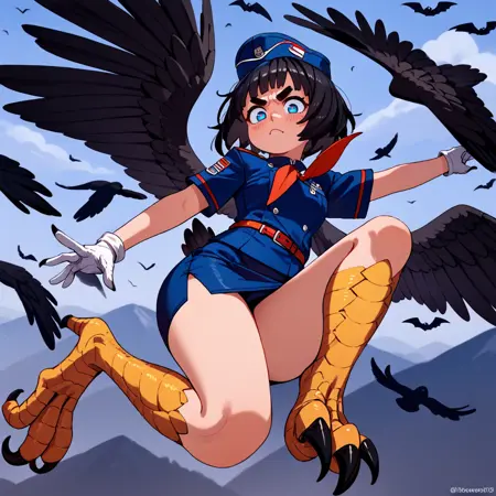 ,snuggy,monster girl,harpy,black hair,short hair,winged arms,feathered wings,black feathers,bird legs,bird tail,talons,blue eyes, bright pupils, thick eyebrows, blunt bangs