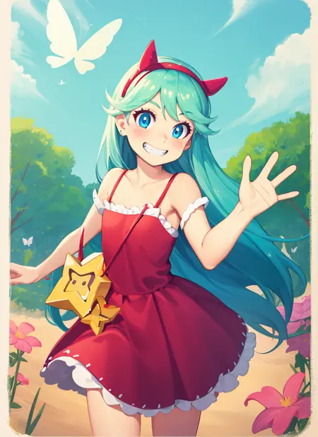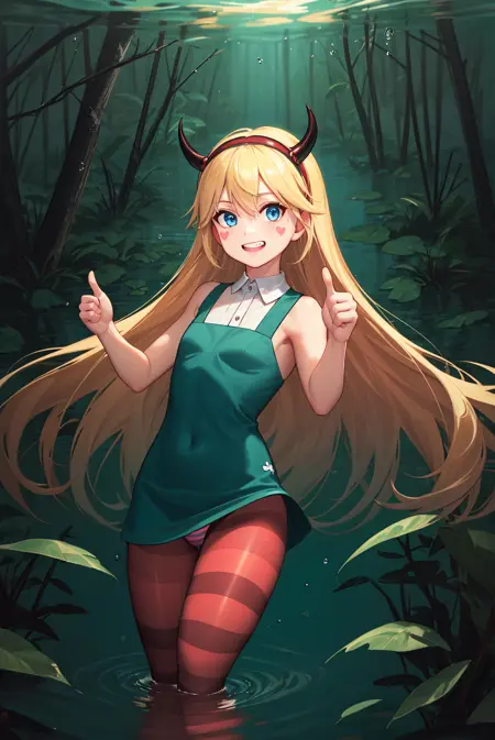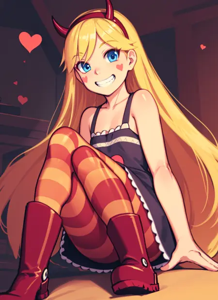 star butterfly, blonde hair, blue eyes, facial mark, fake horns, hairband, heart cheeks, horned headwear, long hair, pantyhose, striped pantyhose,