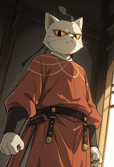 Pony: score_9, score_8_up, score_7_up, score_6_up, score_5_up, score_4_up, libing, whitecatlegend, furry, cat, solo, 1boy, whiskers, yellow sclera, red tunic, belt, hat, looking at viewer, serious expression, ...your tags...
