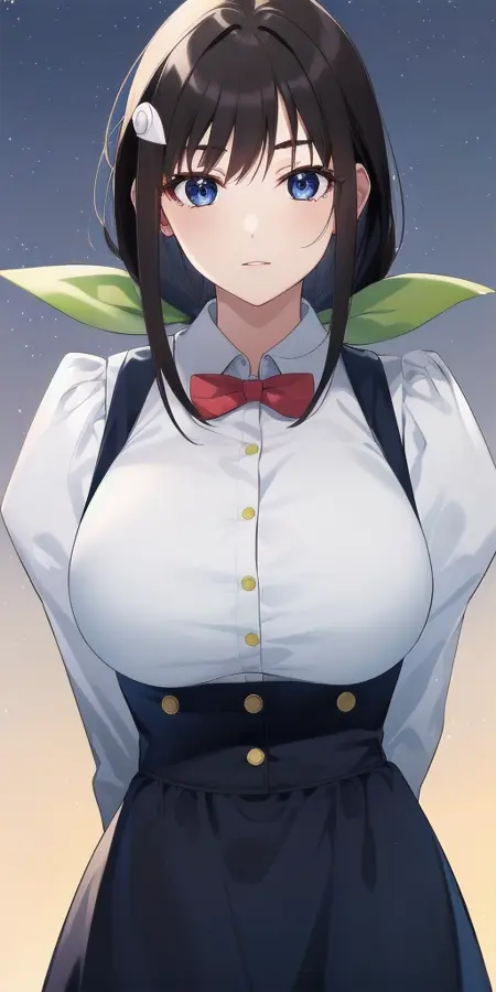 white_shirt_blue_suspender_skirt_juliet_sleeves_frills_red_bowtie: Zoku에서 파란 스스펜더 치마를 입은 복장