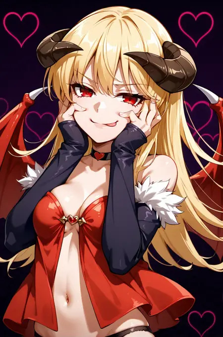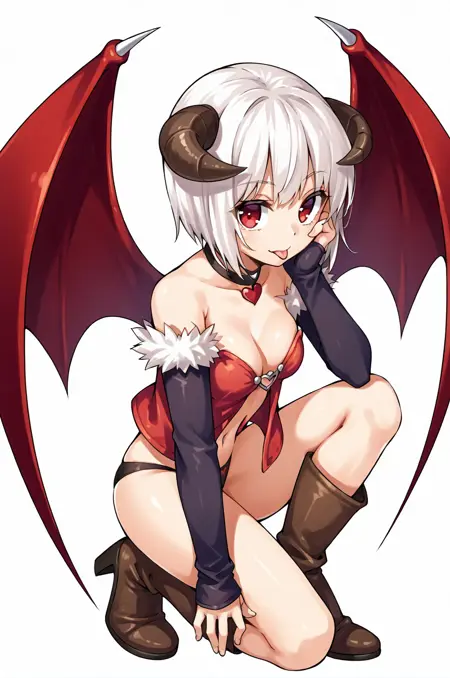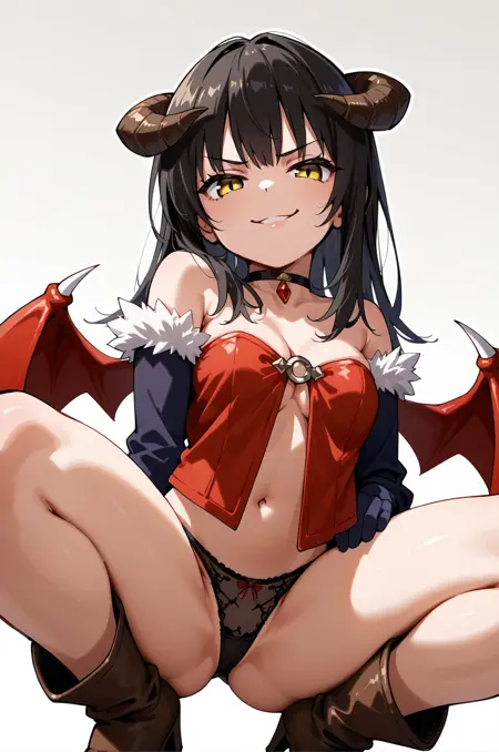 프롬프트: succRO, 다리 고정대, 악마 날개, 뿔, 검은 팬티, 분리형 소매, 팔꿈치 장갑, 목걸이, 배꼽, 털 장식, 하이힐, 갈색 부츠,