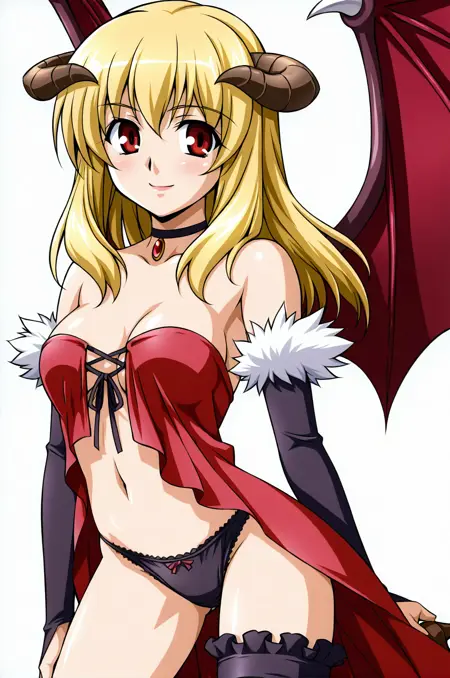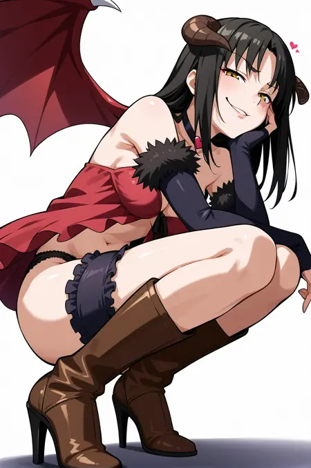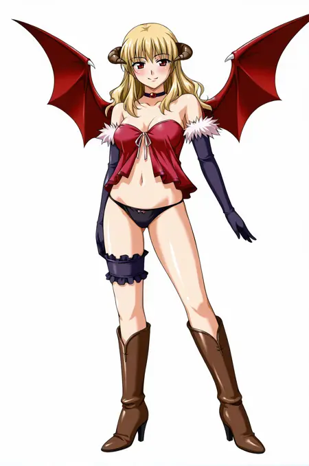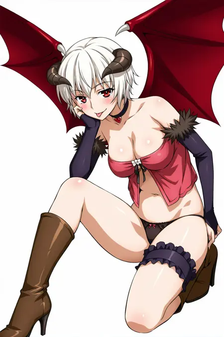 프롬프트: succRO, 다리 레그 가터, 악마 날개, 뿔, 검은 속옷, 분리된 소매, 팔꿈치 장갑, 목걸이, 배꼽, 털 장식, 하이힐, 갈색 부츠,