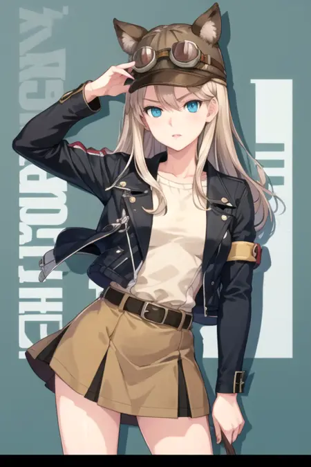 LavianWinslet, 1girl, solo, long hair, blue eyes, miniskirt, blonde hair, shirt, long sleeves, black jacket, open clothes, belt, aqua eyes, open jacket, black headwear, goggles on head, cropped jacket, brown skirt, animal hat,