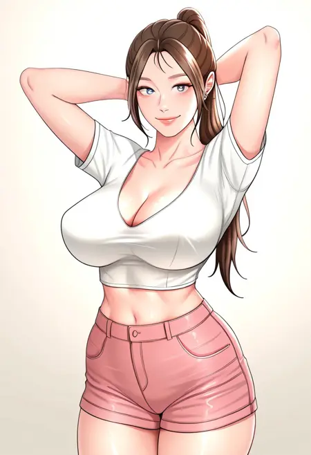 5. ((性感短袖白色上衣,暴露的乳沟,巨大的乳沟,露脐,粉色短裤,)) 白色运动鞋,