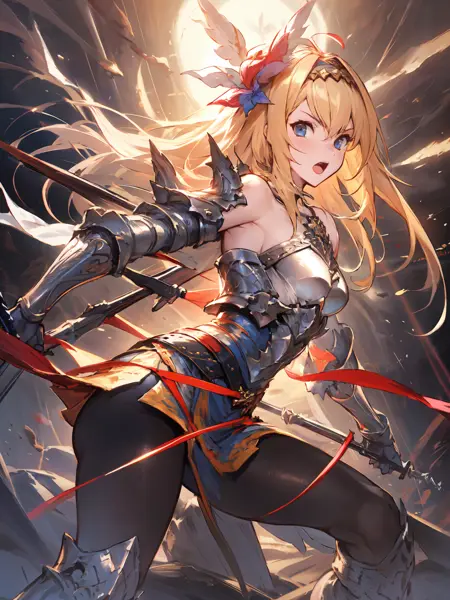 服装6(先導の聖乙女,美德守护者):costume6,白色盔甲,sei shoujo,肩甲,裸露肩膀,双手持武器,长杆武器,剑,金色镶边,黑色连裤袜,内层蓝红裙,靴子,红丝带