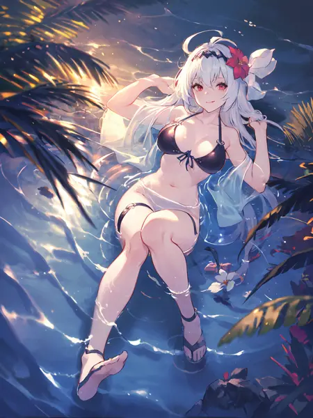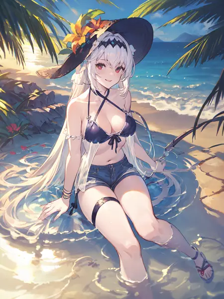 --V2:泳装,黑色比基尼,黑色草帽(或无),大腿束带,凉鞋,短短裤,透视效果,辫子,(面纱)