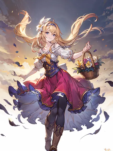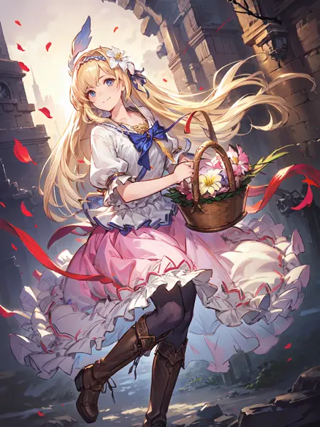 服装2(純朴なる乙女,村姑):costume2,村姑,手持花篮,长粉裙,荷叶边,白色上衣,靴子,黑色连裤袜,黄蝴蝶结,发带