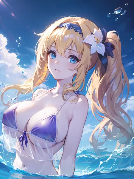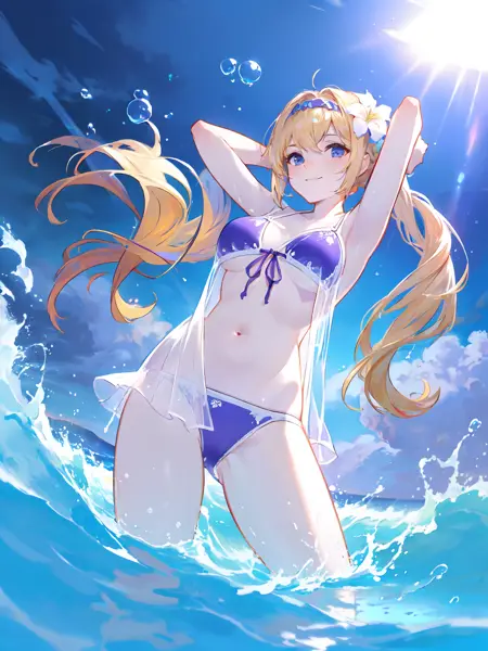 服装4(泳装):costume4,泳装,紫色比基尼,(侧)马尾,超长发,透视效果,发花