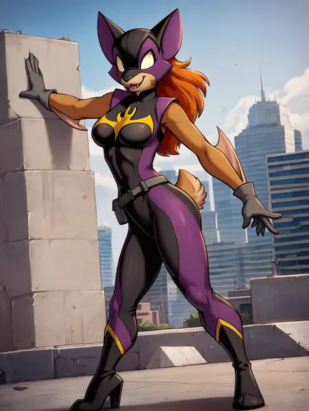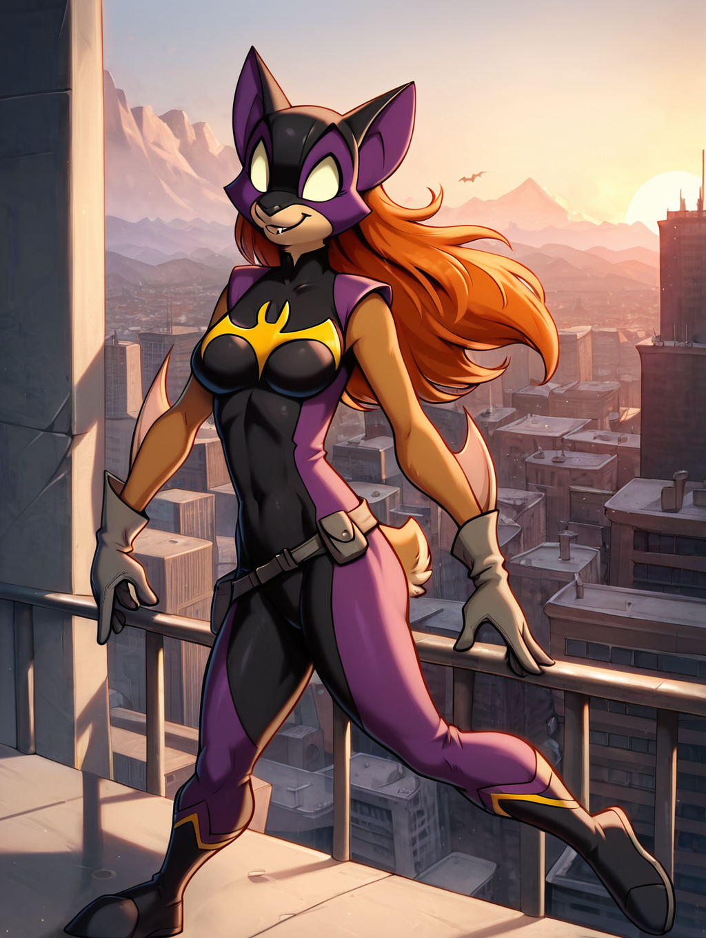 chiropterana, superhero, chiropterana outfit, tight spandex outfit, mask on head, two-tone outfit, two-tone fur, orange hair, brown fur, anthro, medium breasts, yellow bat symbol on chest, yellow eyes, black and purple outfit, bat girl, bat ears