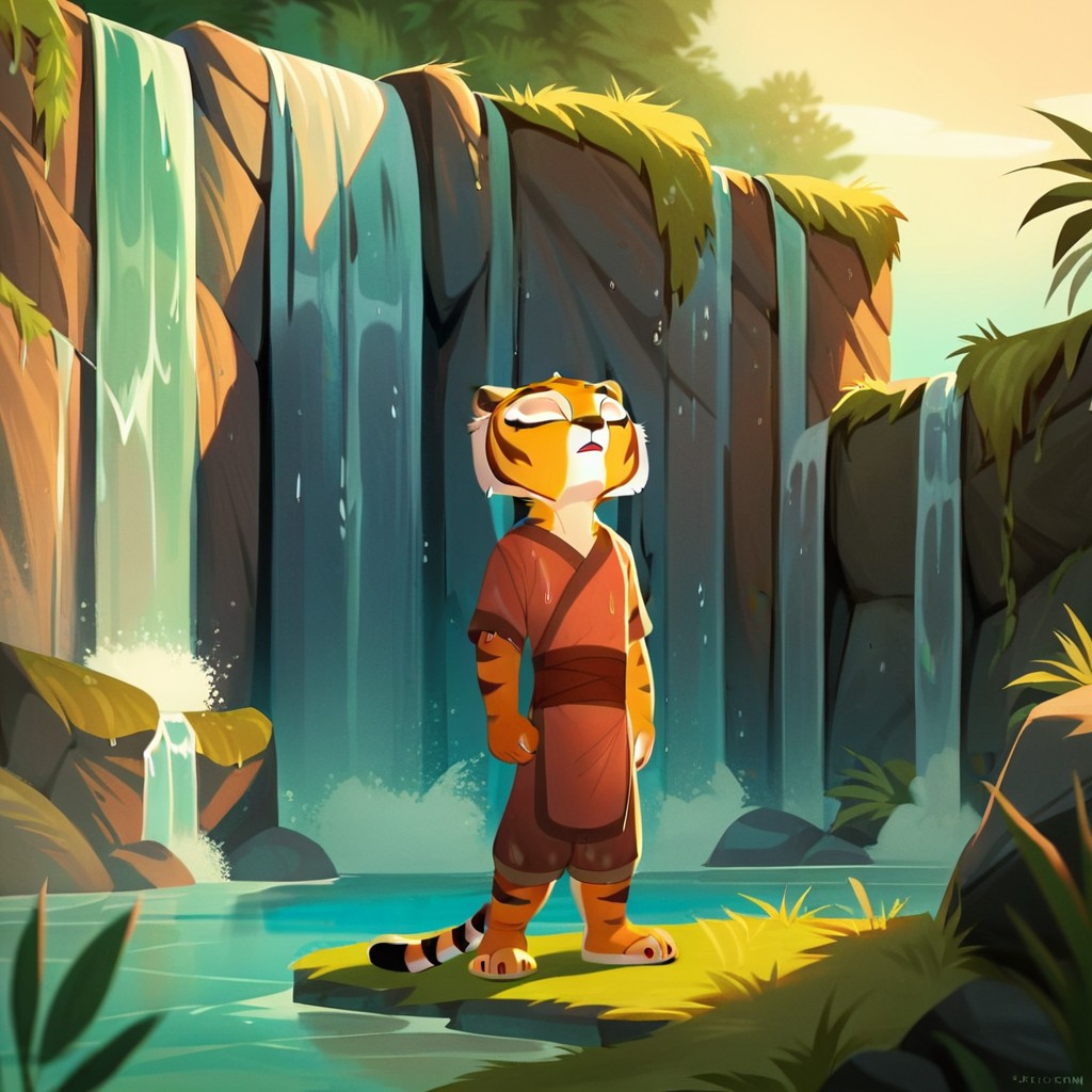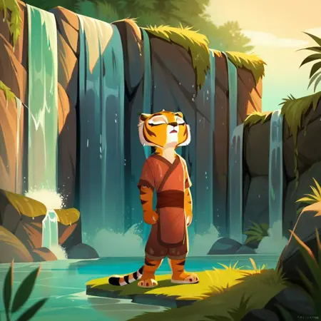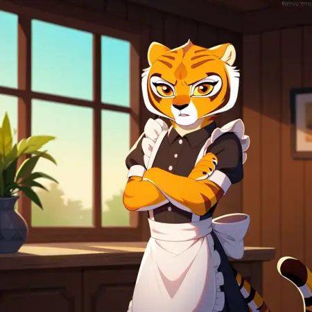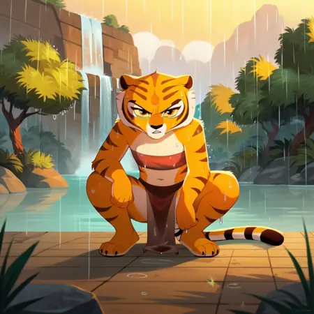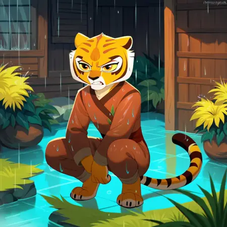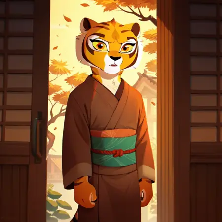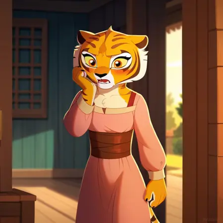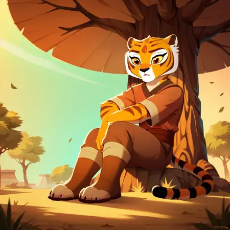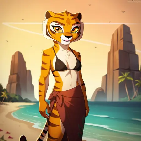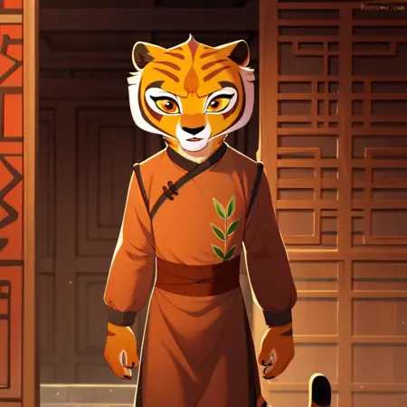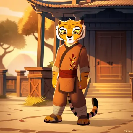 tigresskfp, anthro, female, tiger, young anthro, amber eyes, yellow sclera, shirt, pants, leg wraps, sandals,