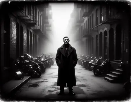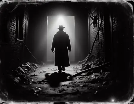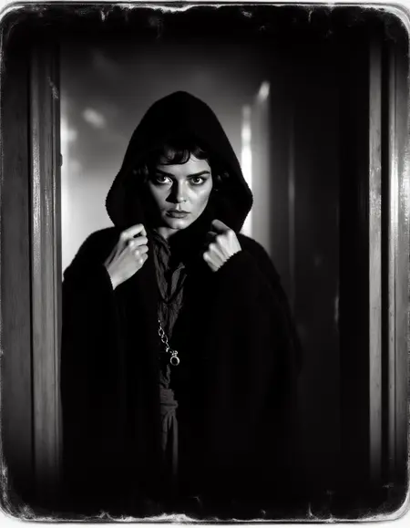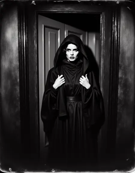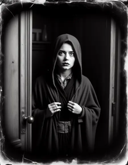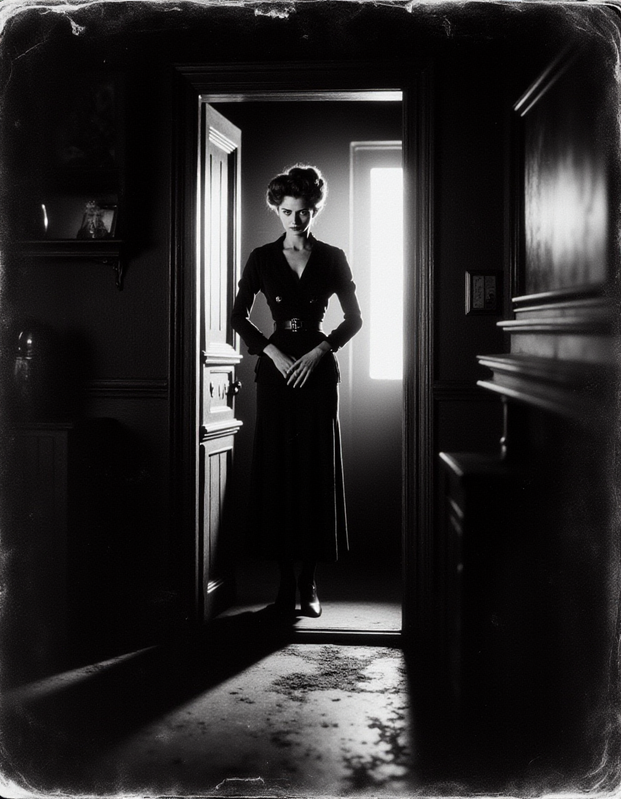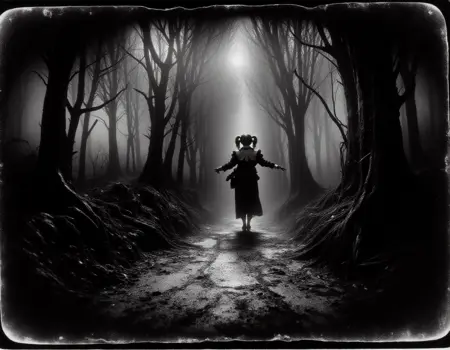 "TheScaryDoor, 1900년대 거친 흑백 사진, 장면은 긴장감 있고 무서운 분위기입니다. 당신은 숲을 걷고 있고, 눈의 모서리로 그를 발견합니다. 쉐이 르부프"