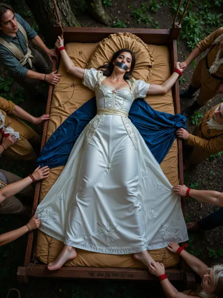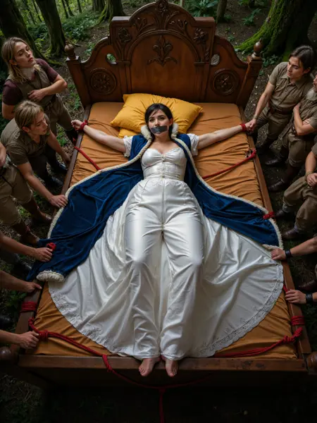 “这是一张高分辨率照片,拍摄了一名年轻女性俯卧在床上,从背后视角展现。她的四肢被绳索绑在床架上,双臂和双腿完全张开,受到严苛的捆绑。她被蒙住双眼,嘴巴被胶带封住。她躺在一张整洁的床上,铺着白色床单和枕头。这位女性年龄介于21至30岁之间,肤色白皙,拥有一头齐肩的金色头发。她的双腿大开,露出裸露的臀部和阴道,一枝亮粉色假阳具部分插入她的阴部,遮挡了部分区域。她的身材纤细紧致,拥有中等大小的乳房。”