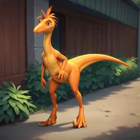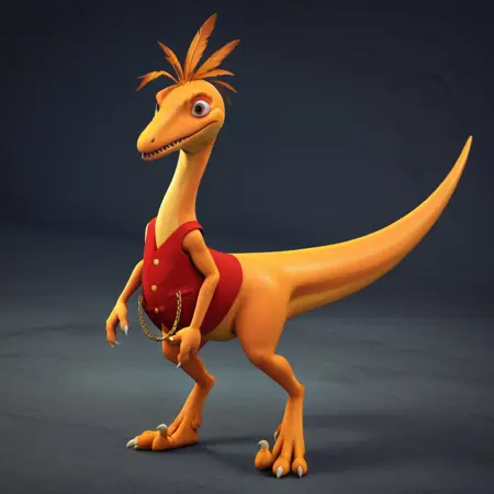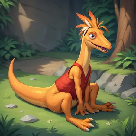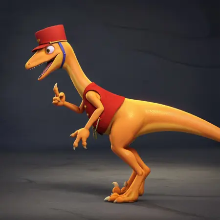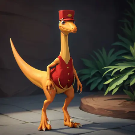dtmrconductor, feral, male, Troodon, Theropod, orange skin, red gilet with golden buttons, red hat