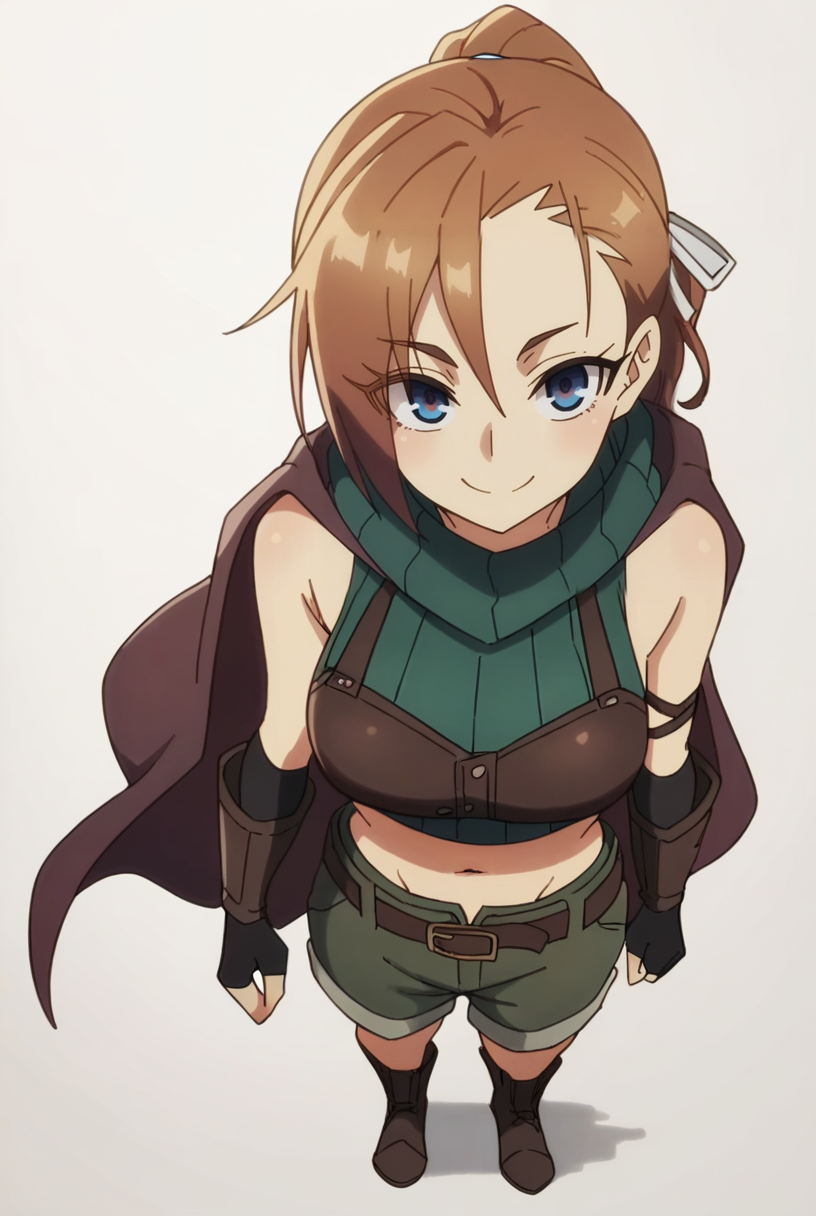 - brown crop top,belt,green shorts,fingerless gloves,navel,elbow gloves,hair ribbon,turtleneck,sleeveless,green sweater,black gloves,white ribbon,brown boots,black socks,bare shoulders,