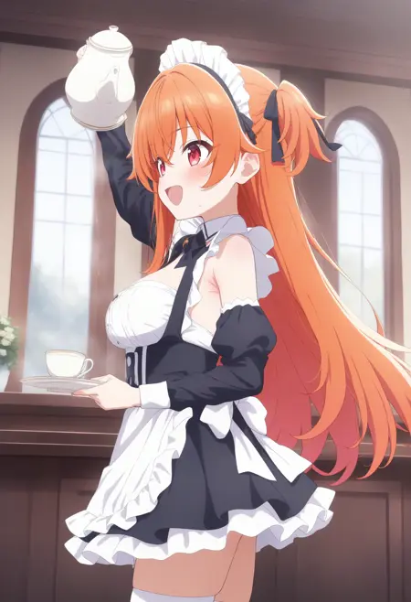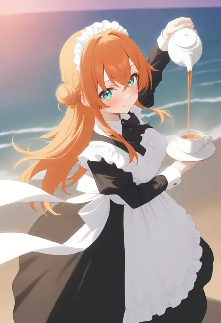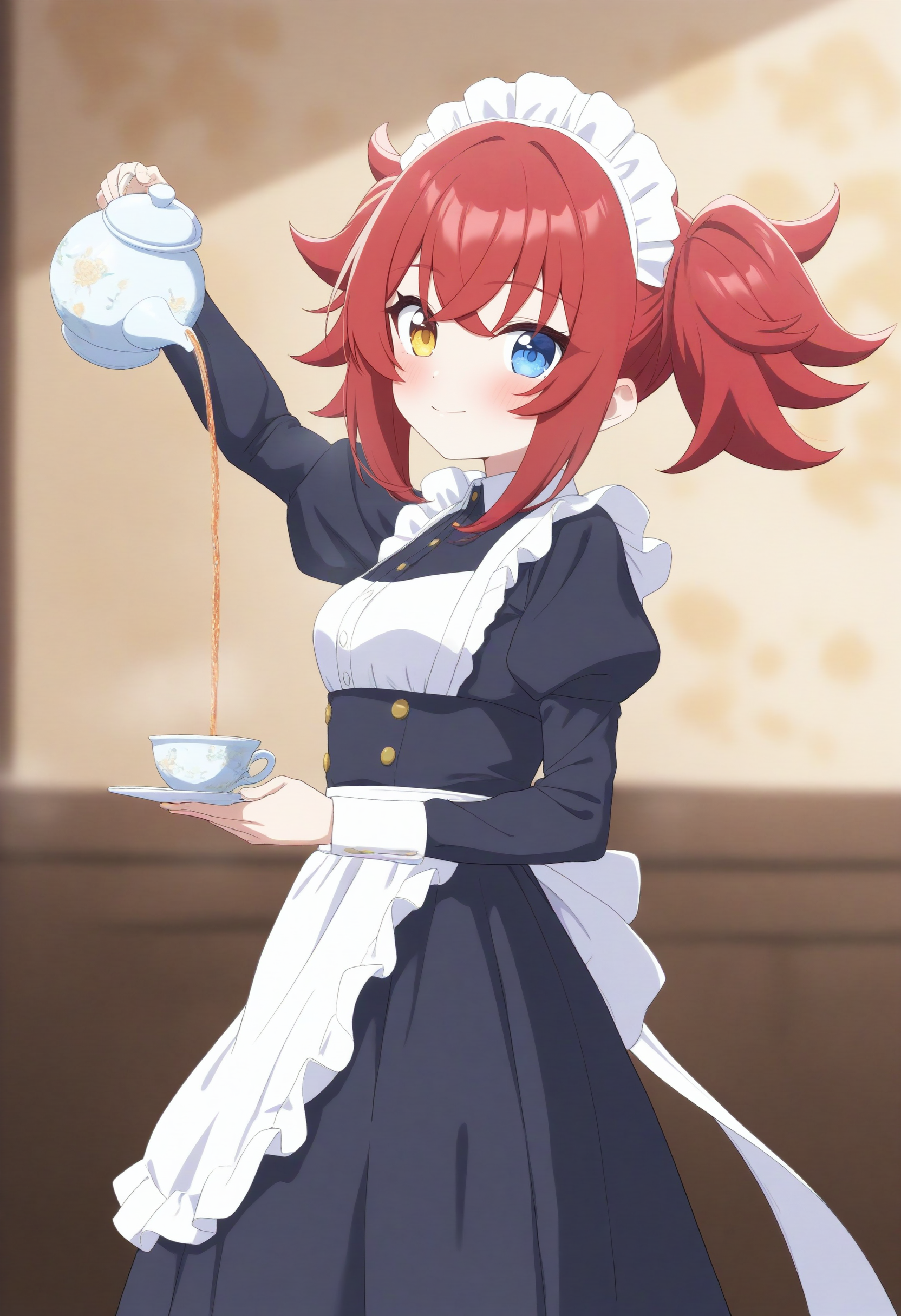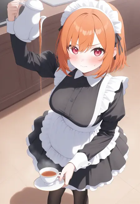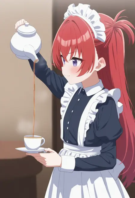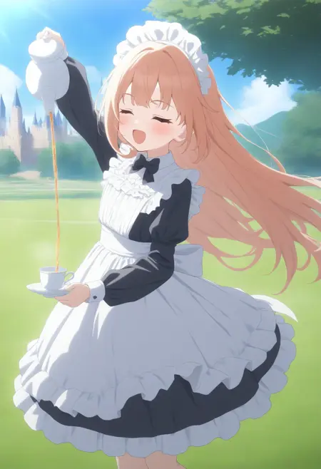 ティーポットから紅茶を注ぐ時に高い位置にポットを持っていき、低い位置に持ったティーカップへ注ぐLoRAです。