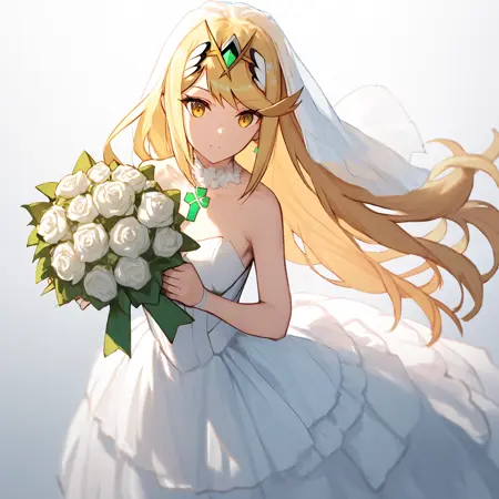 默认:mythradef, 金色头发, 黄色眼睛, 长发, 王冠, 耳环, 胸部露空, 肘部手套, 裸露肩膀, 服装露空, 白色连衣裙, 白色手套, 胳膊护甲, 无袖连衣裙, 白色短裙, 百褶裙, 胸部宝石, 大腿绑带,
